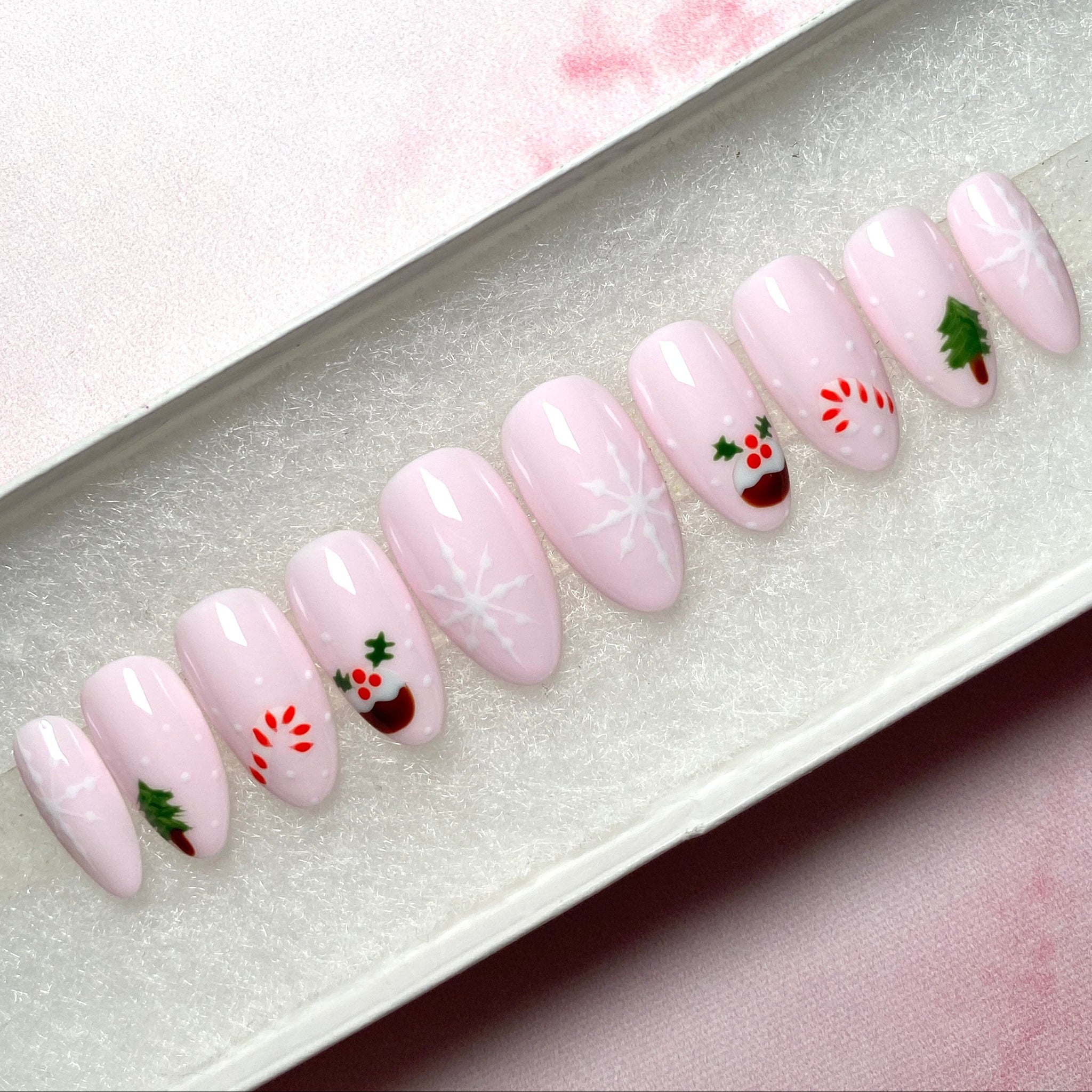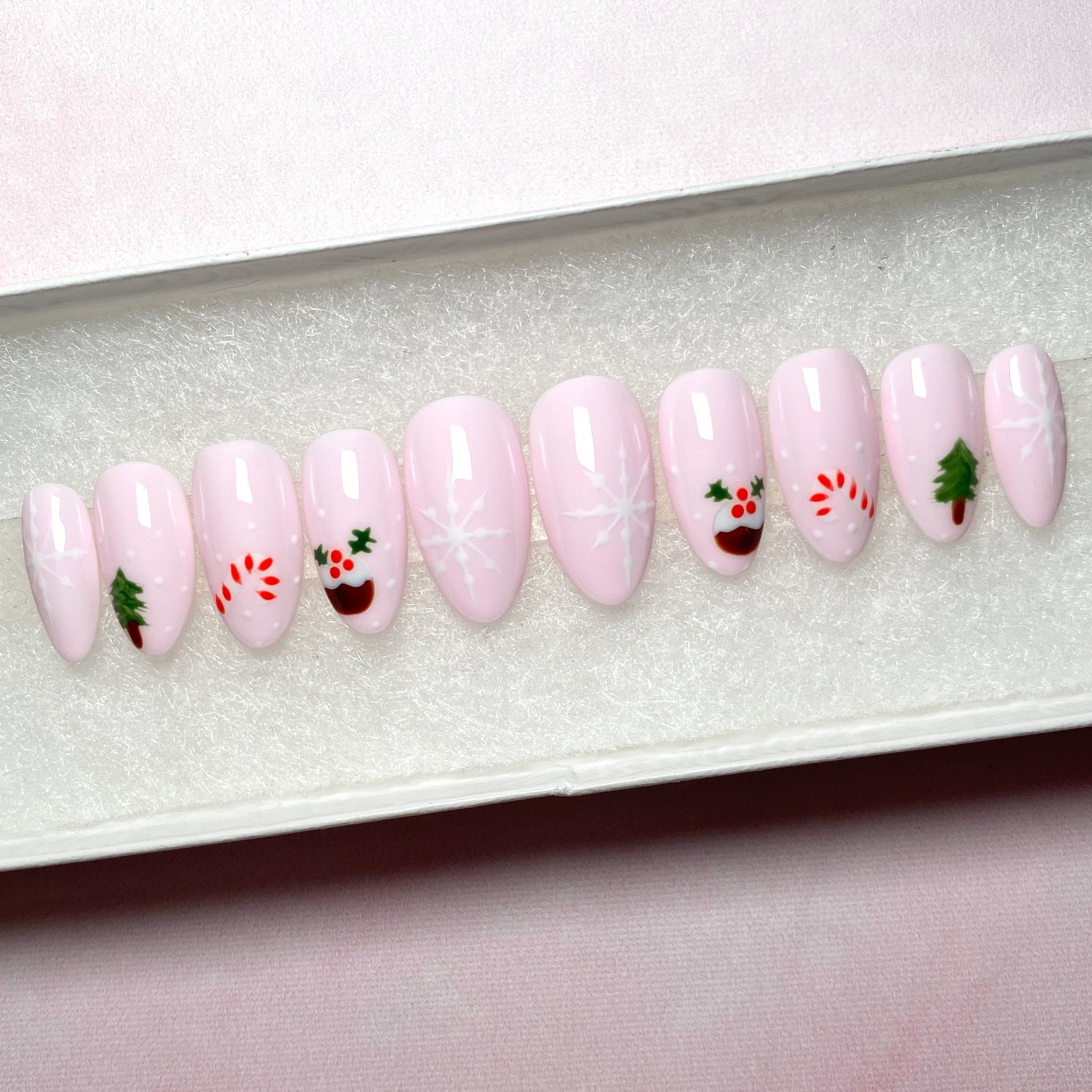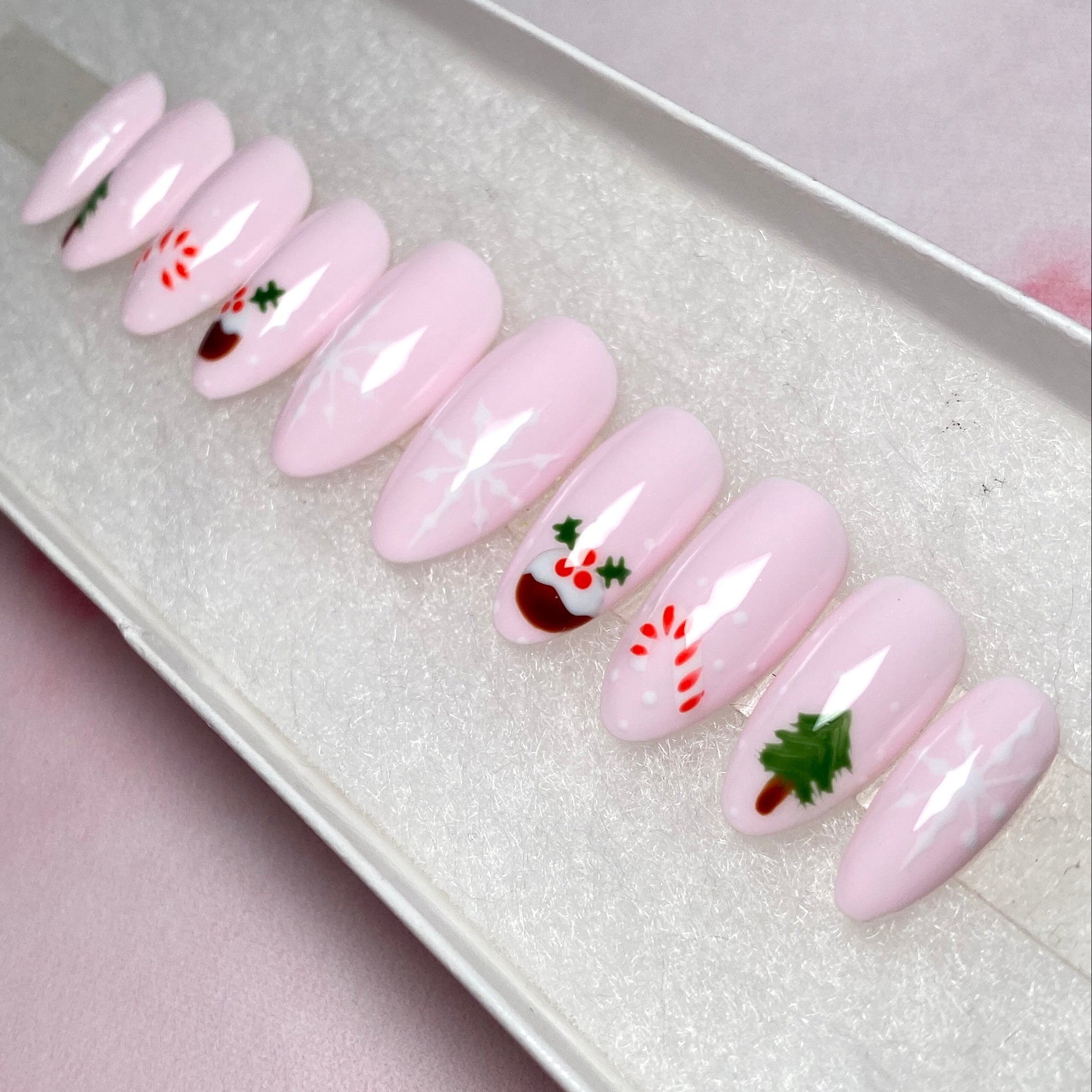 ✨Christmas Treats✨ Christmas Tree, Candy Cane, Christmas Pudding and White Snowflakes on a Light Pastel Milky Pink Base