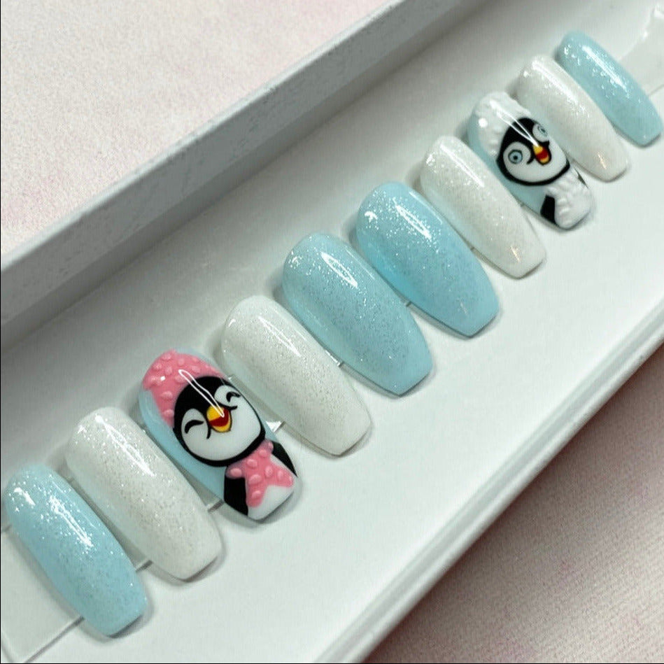 ✨It's Cold Outside✨ Christmas Holiday Set: Baby Blue and White Glitter featuring 2 Cute Penguins in 3D Scarves