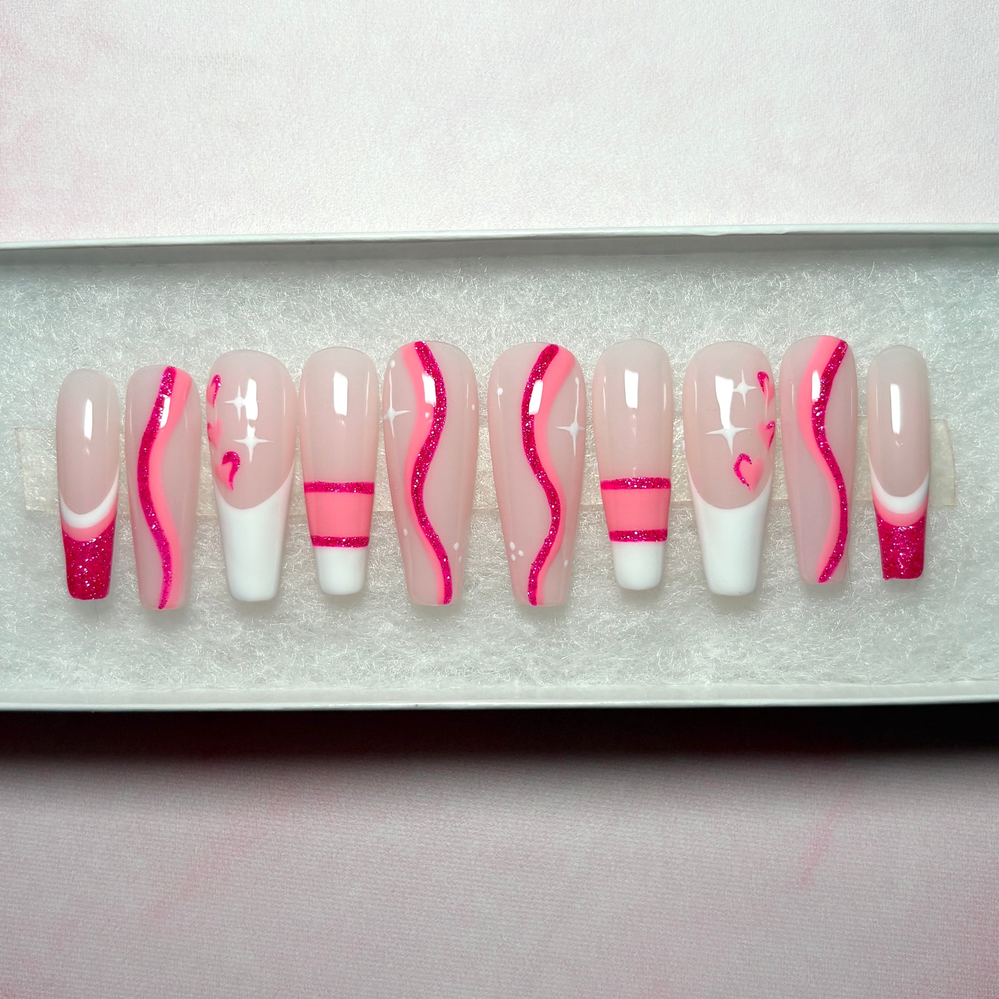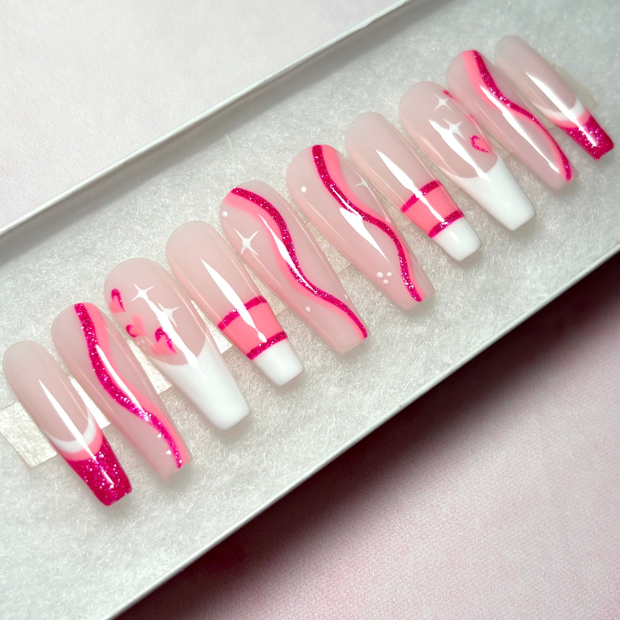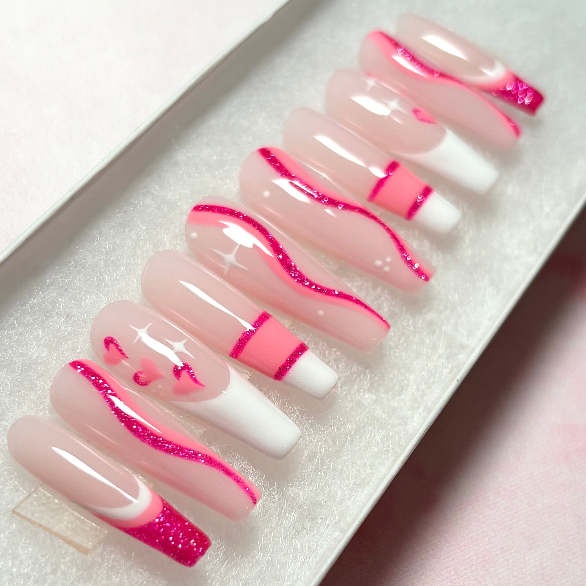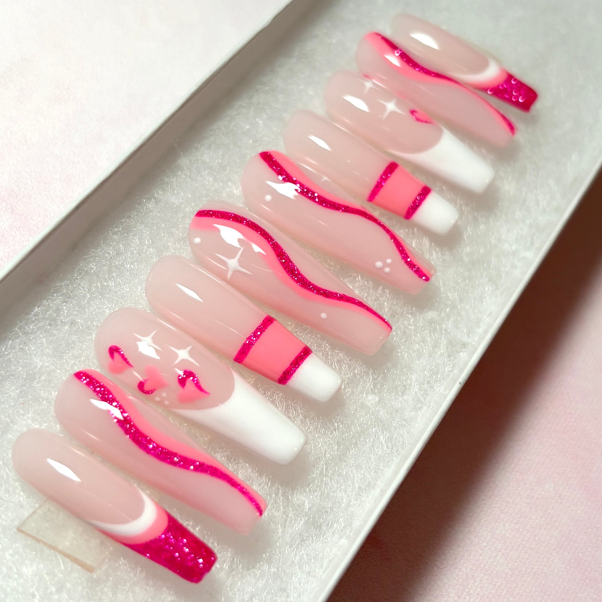 ✨Kiss & Tell✨ Pinks and Whites with Delicate 2-Tone Pink Hearts and Pink Swirls, Geometric Lines, French Tips and A Touch of Glitter.