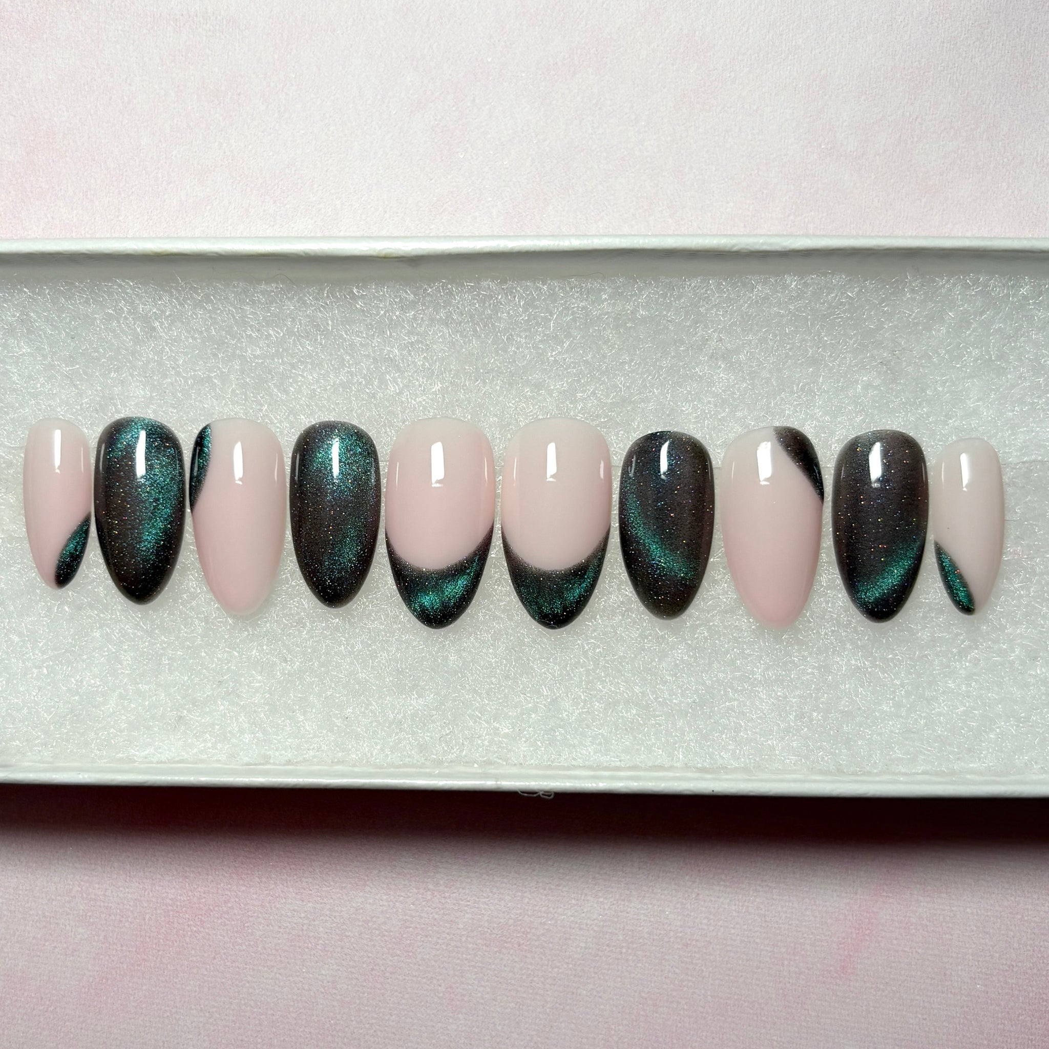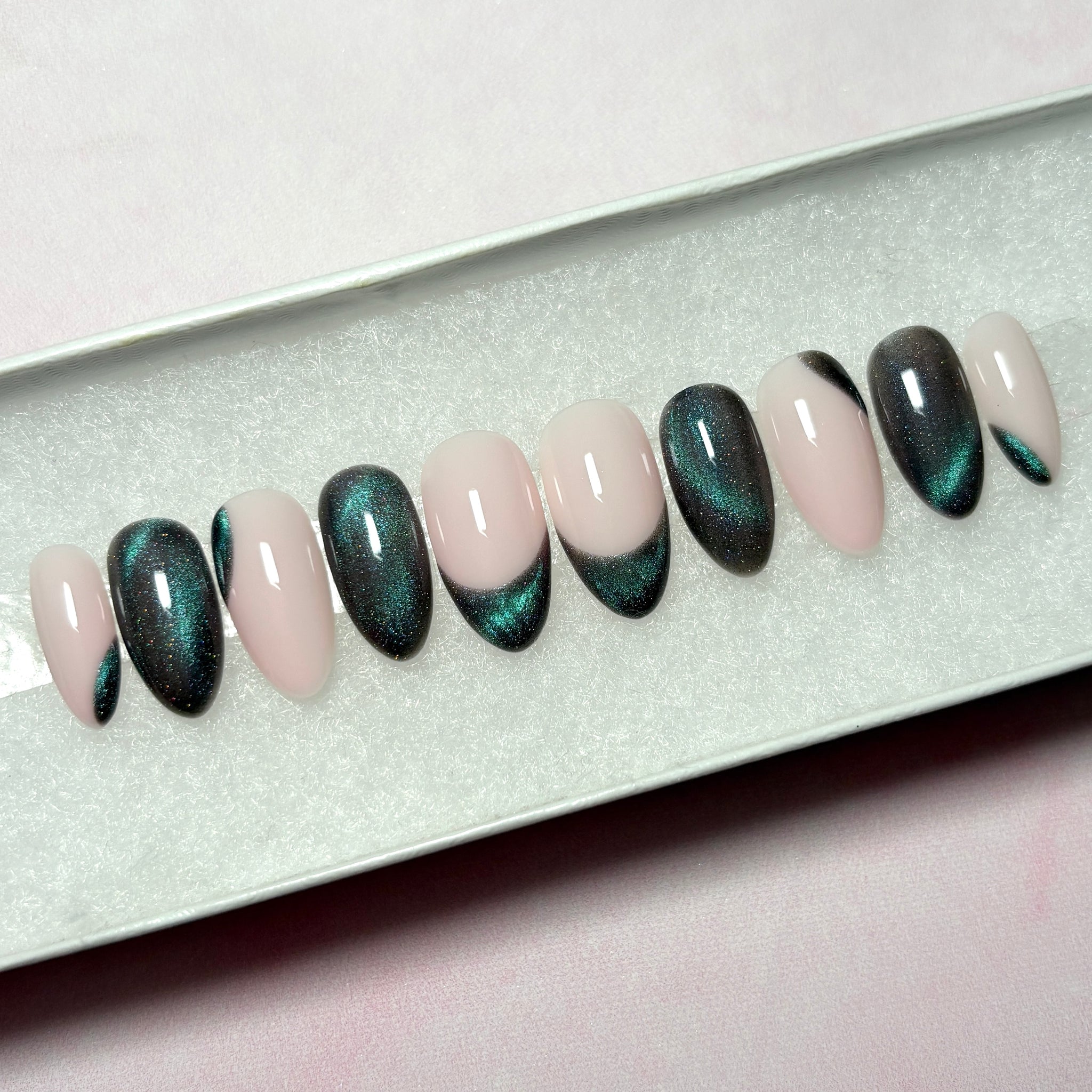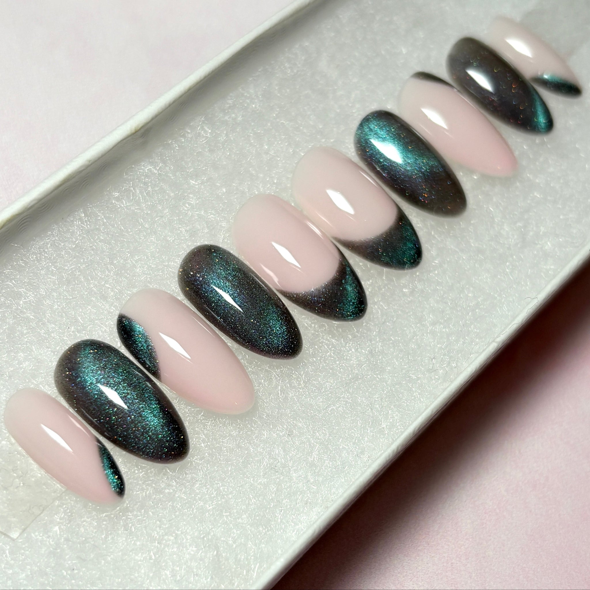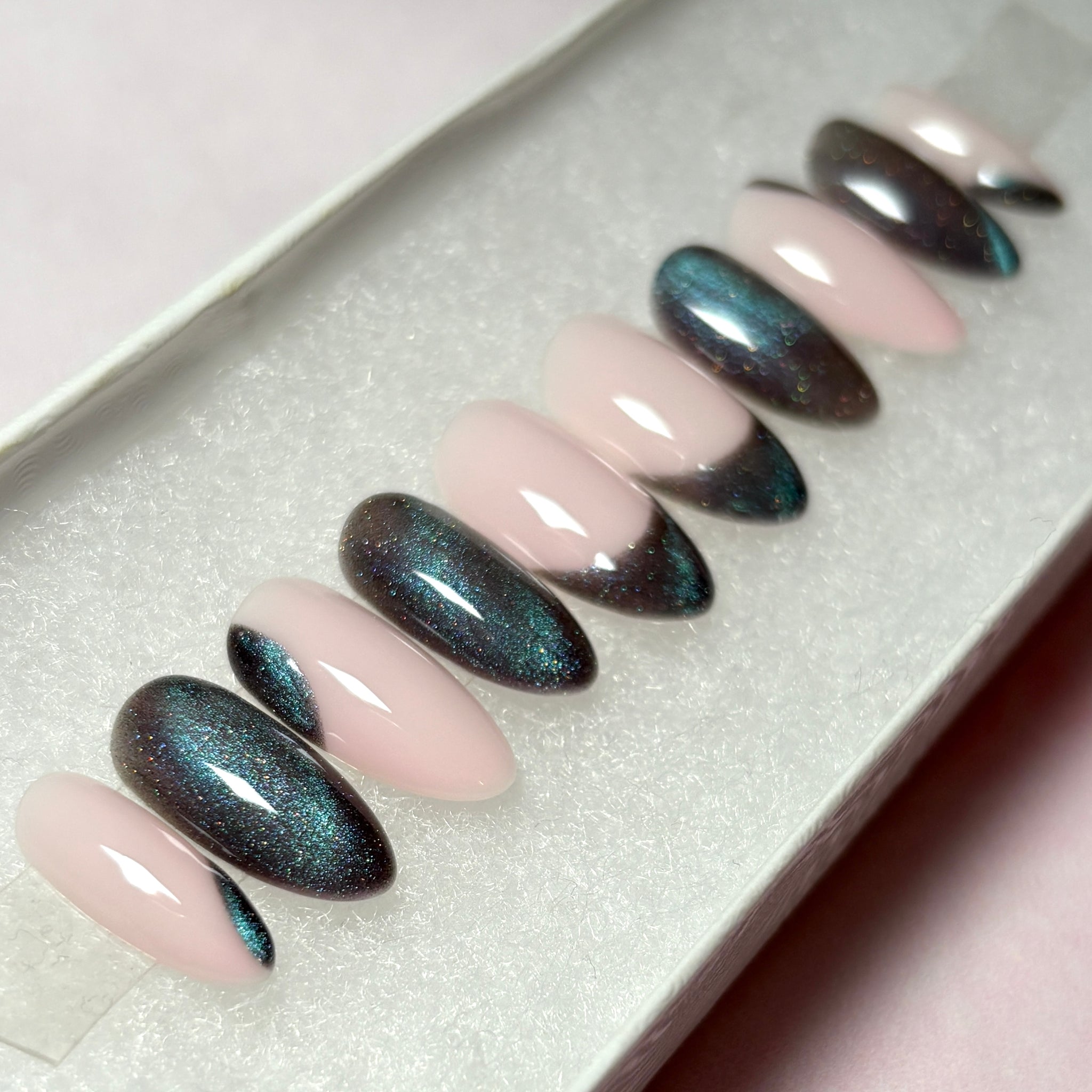 Cat eye French tips handmade press-on nails in shimmery colour-shifting greys, greens, blues, purples. Created by a professional nail artist, these custom false nails offer a salon-quality finish with the convenience of reusable stick-on nails. All of the sets are available in short, long and 5+ shapes.