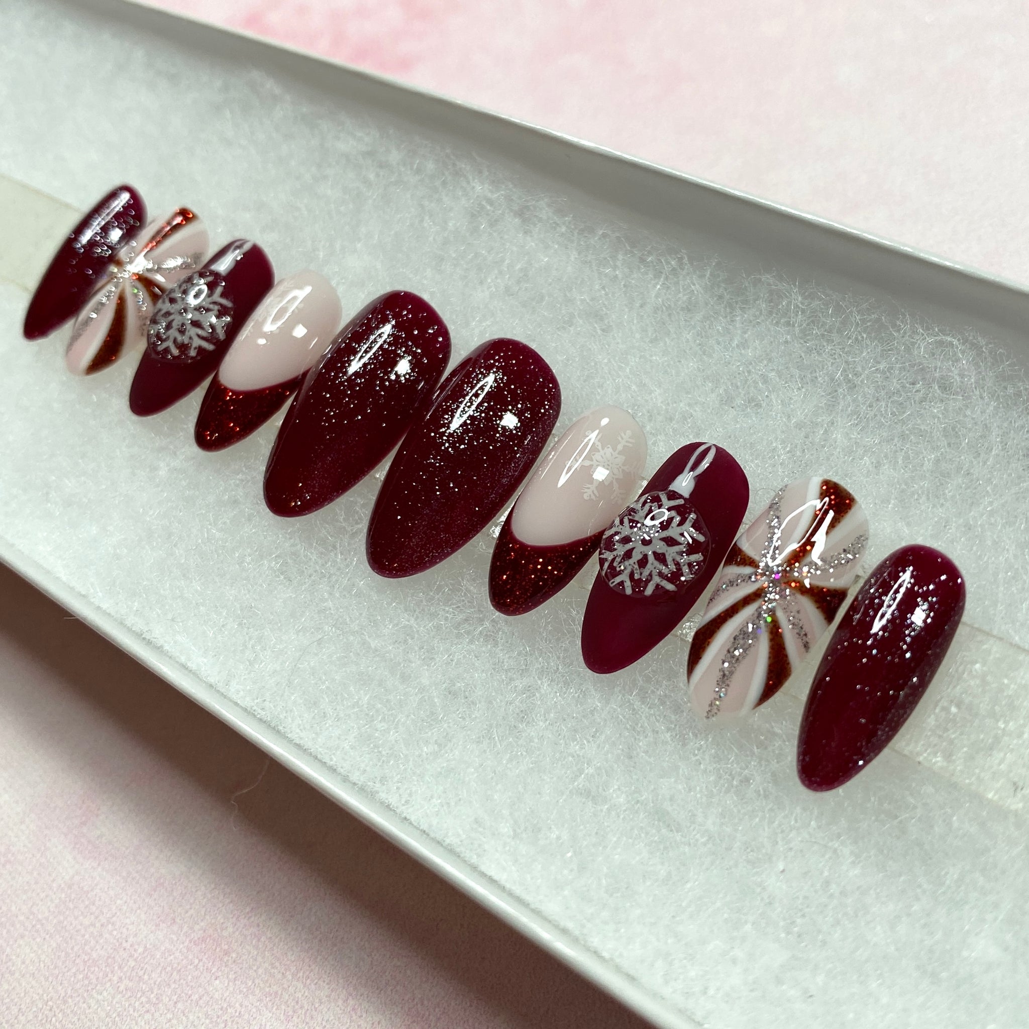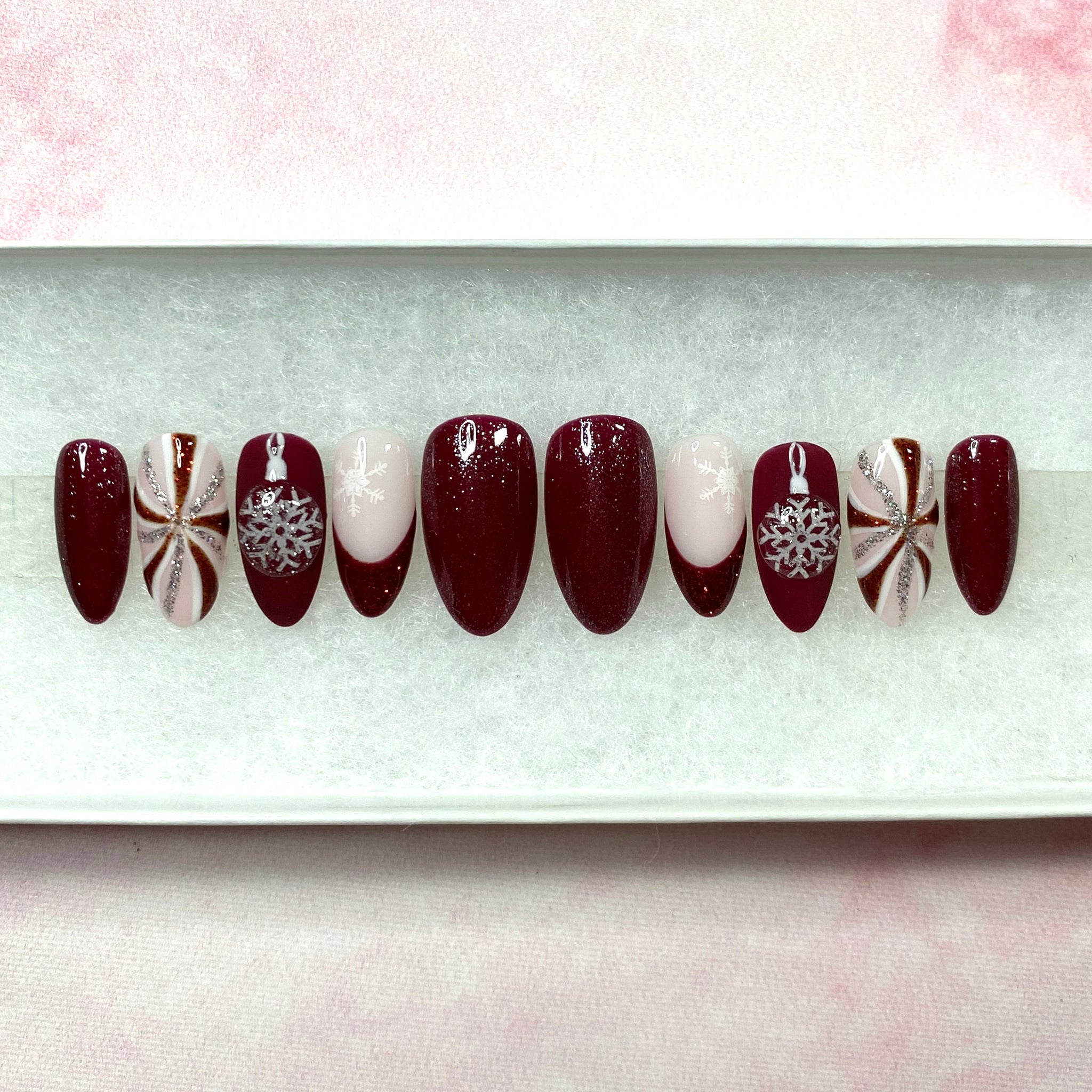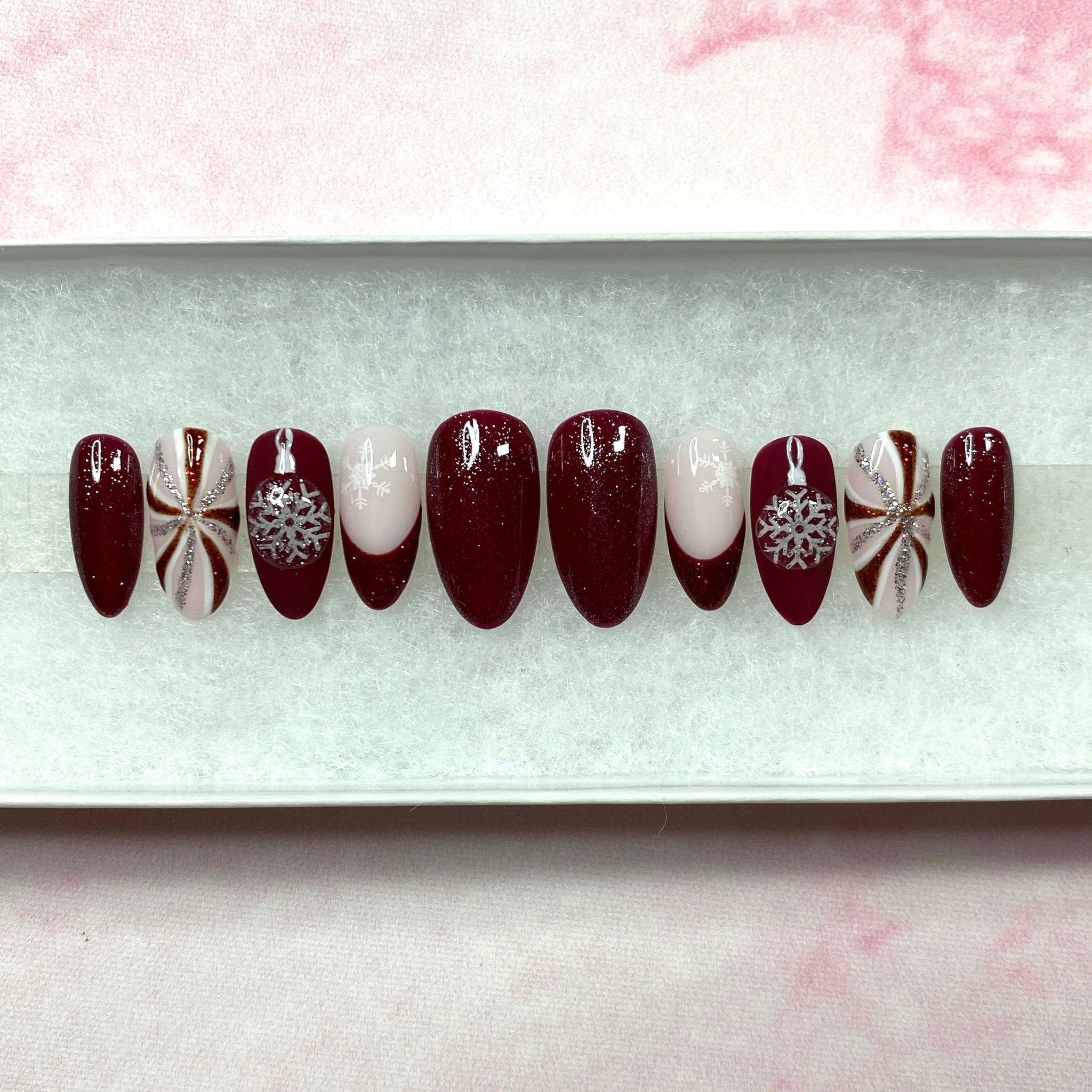 ✨Noel ✨ Deep Red, White and Silver with 3D Translucent Christmas Baubles with Snowflake and Glitter Inside,Red/White/Silver Glitter Christmas Design, White Snowflakes and 2 French Tips