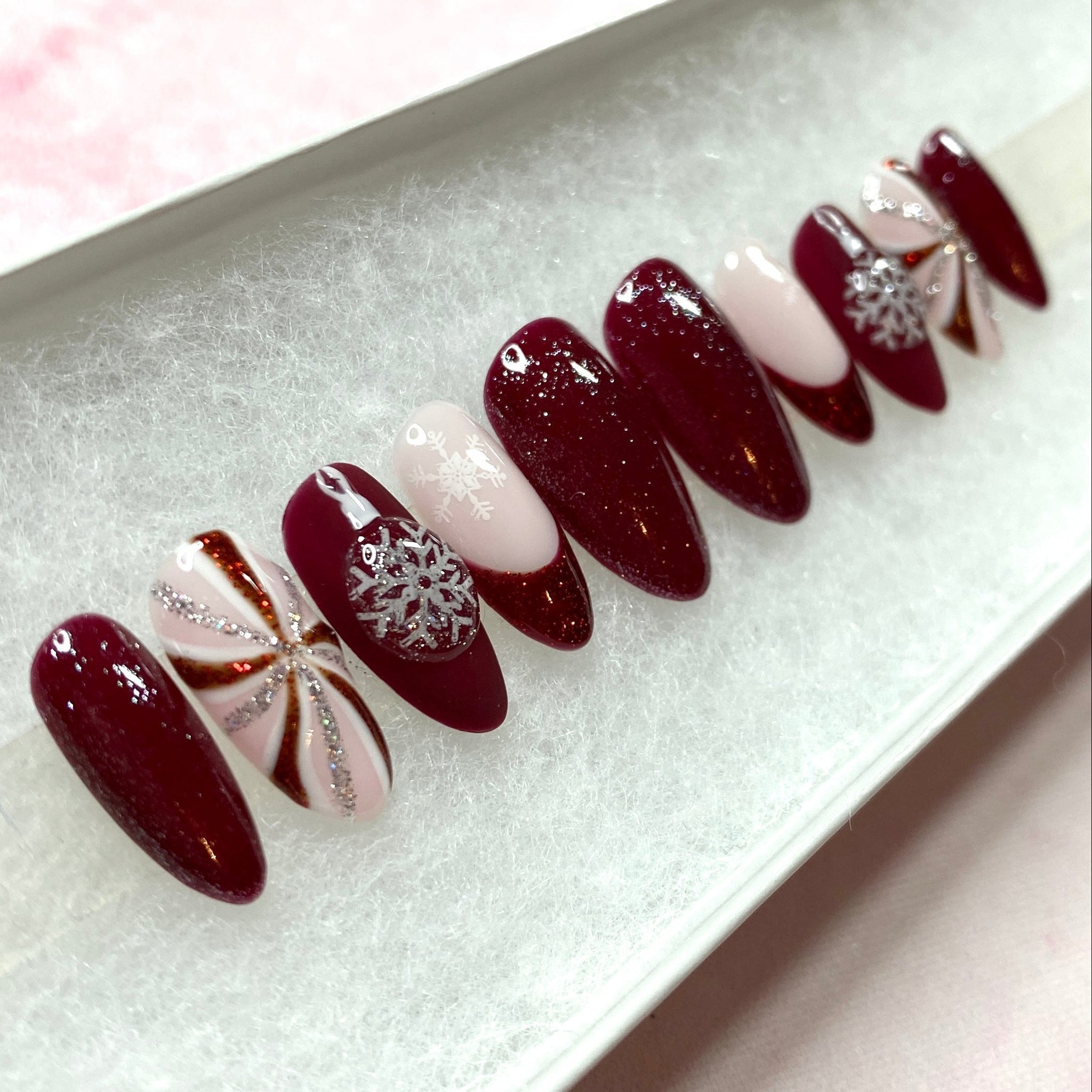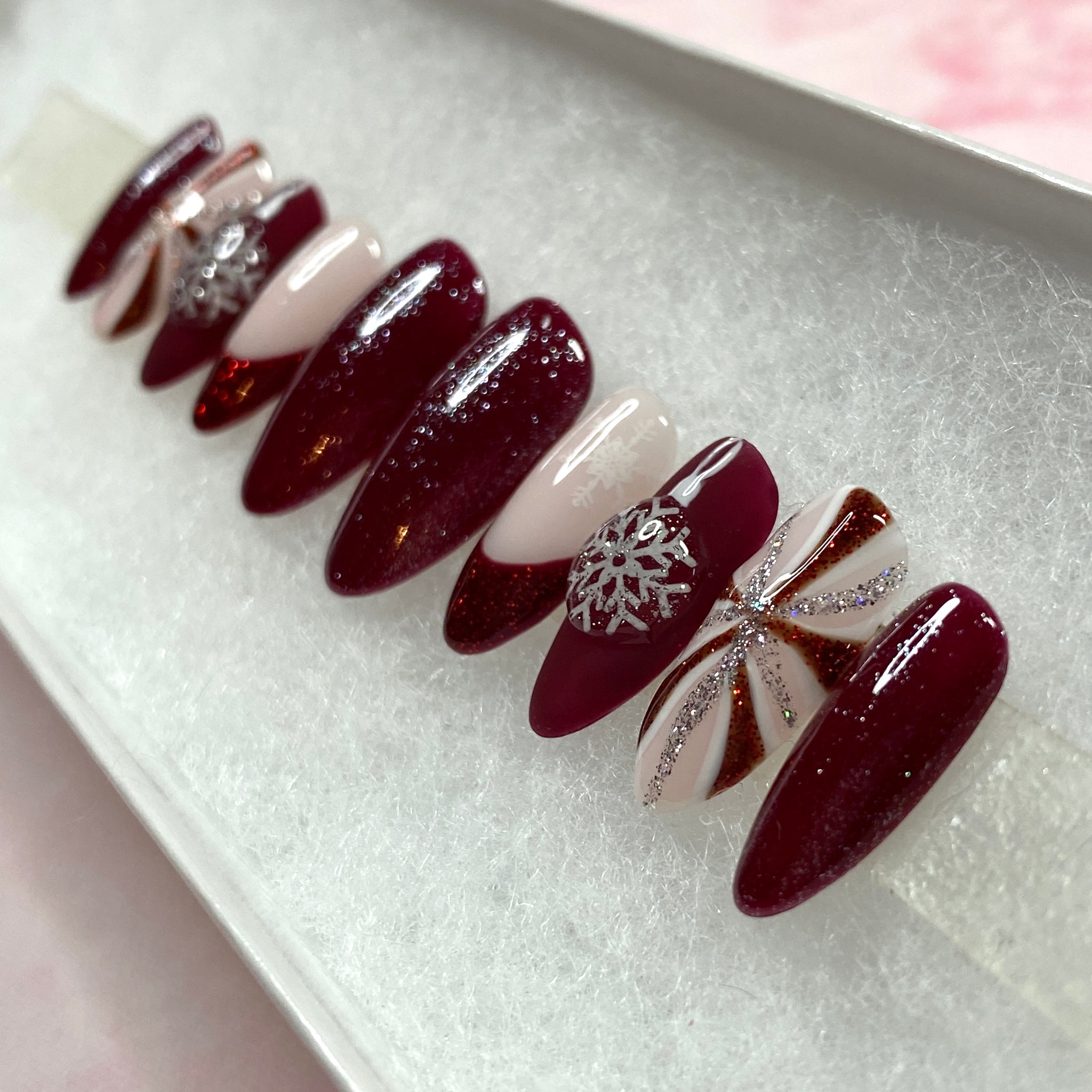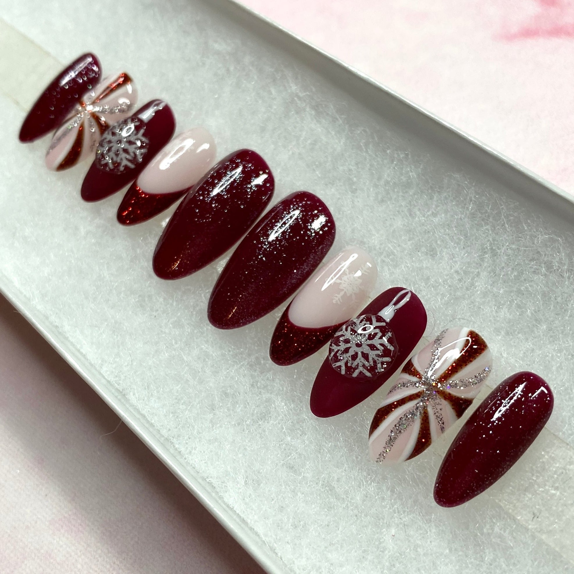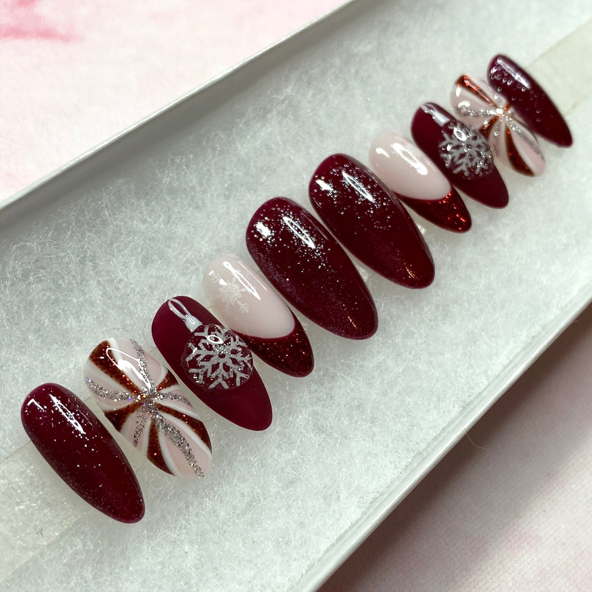 ✨Noel ✨ Deep Red, White and Silver with 3D Translucent Christmas Baubles with Snowflake and Glitter Inside,Red/White/Silver Glitter Christmas Design, White Snowflakes and 2 French Tips