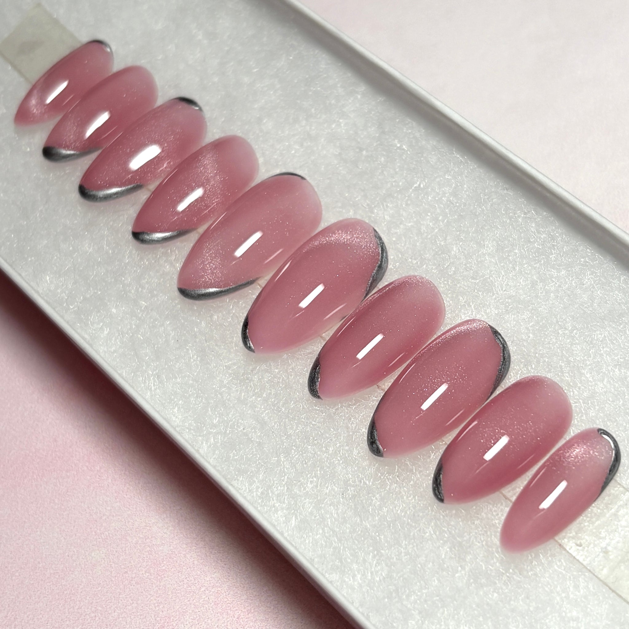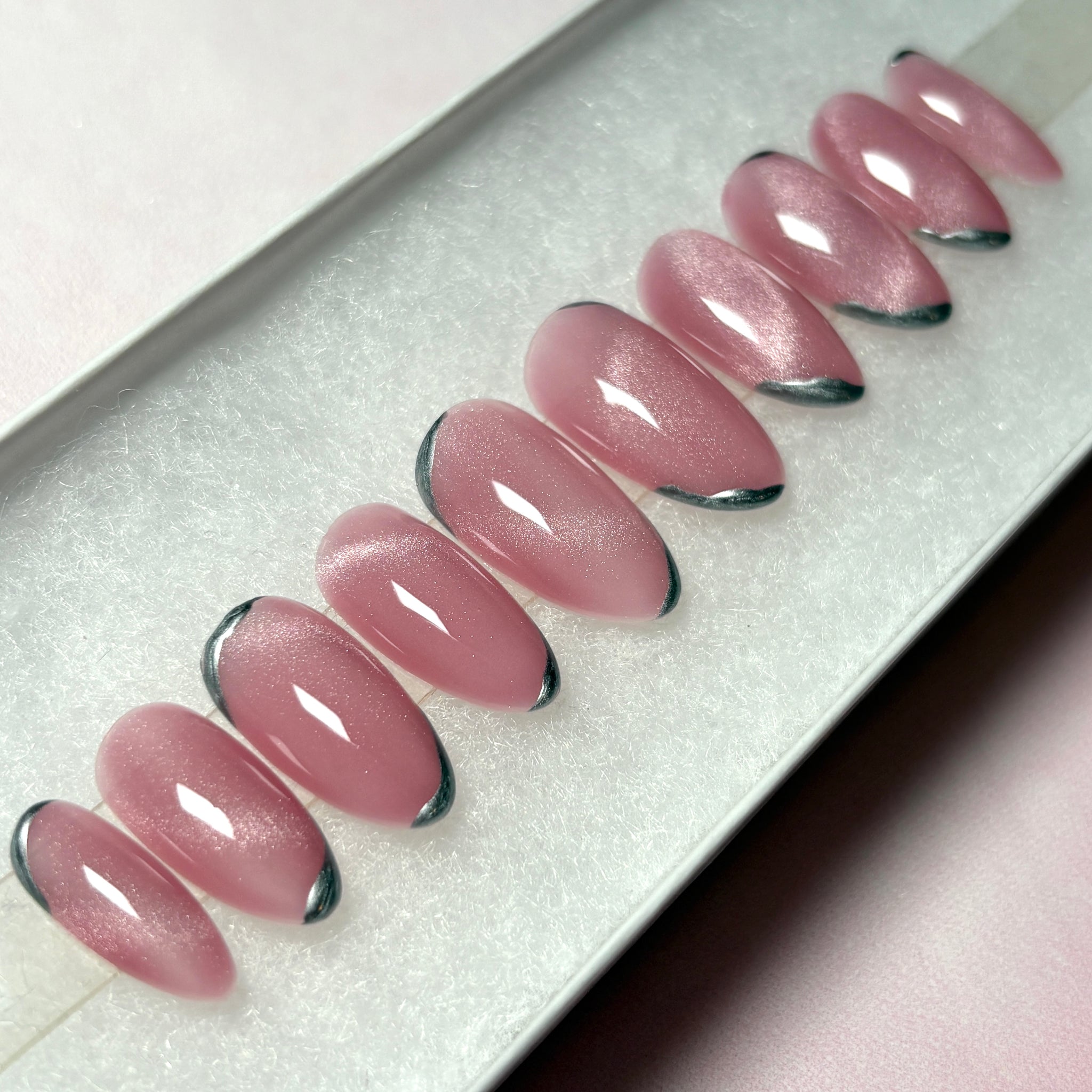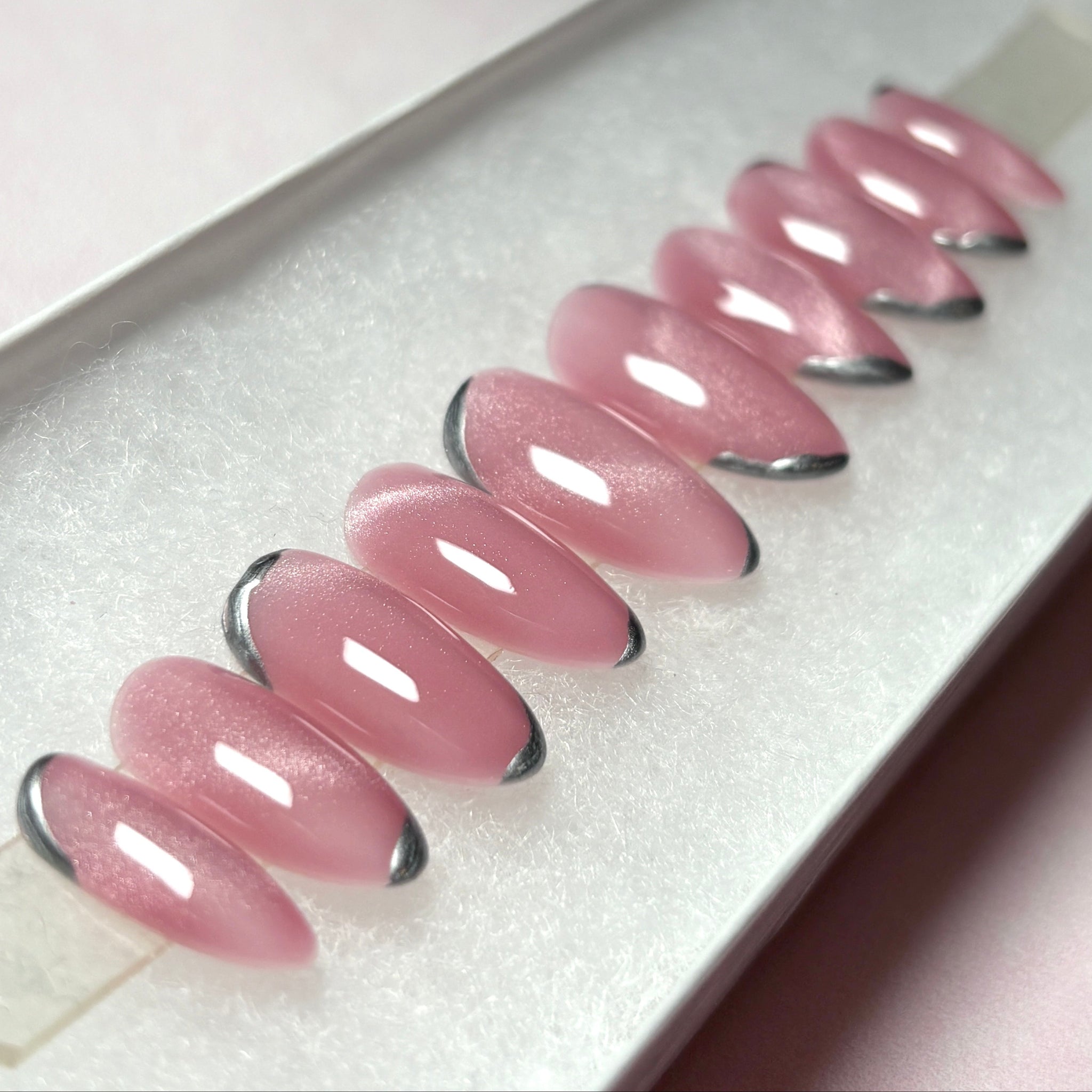 Cat eye press-on nails in shimmering pink with silver chrome accents. Handmade by a professional nail artist, these custom false nails offer a salon-quality finish with the convenience of reusable stick-on nails. All of the sets are available in short, long and 5+ shapes.