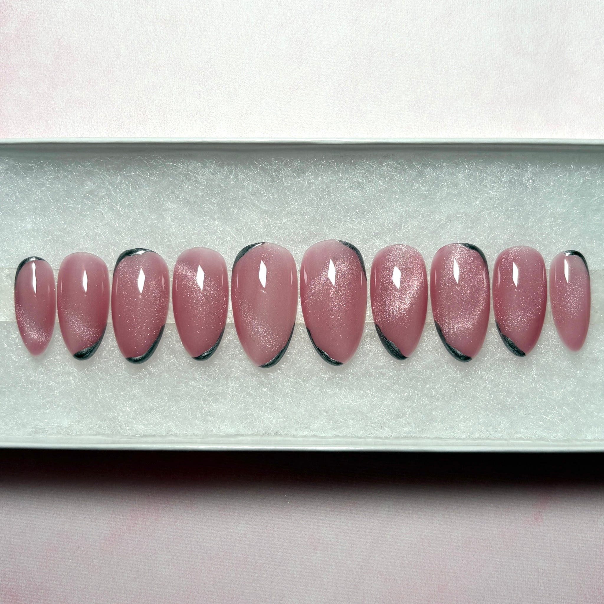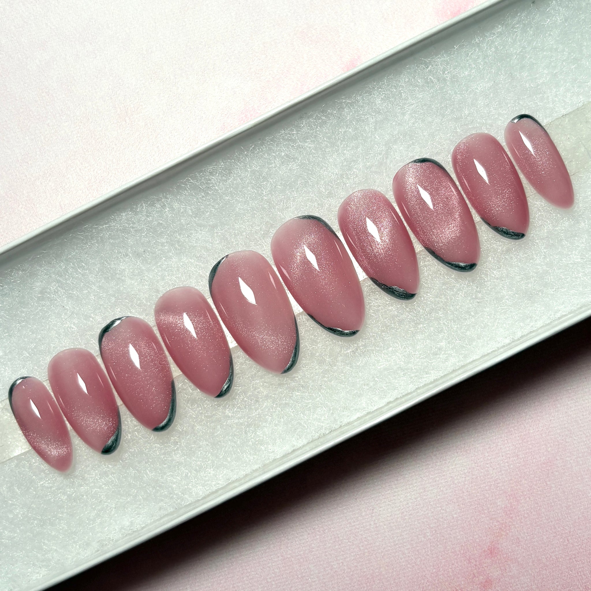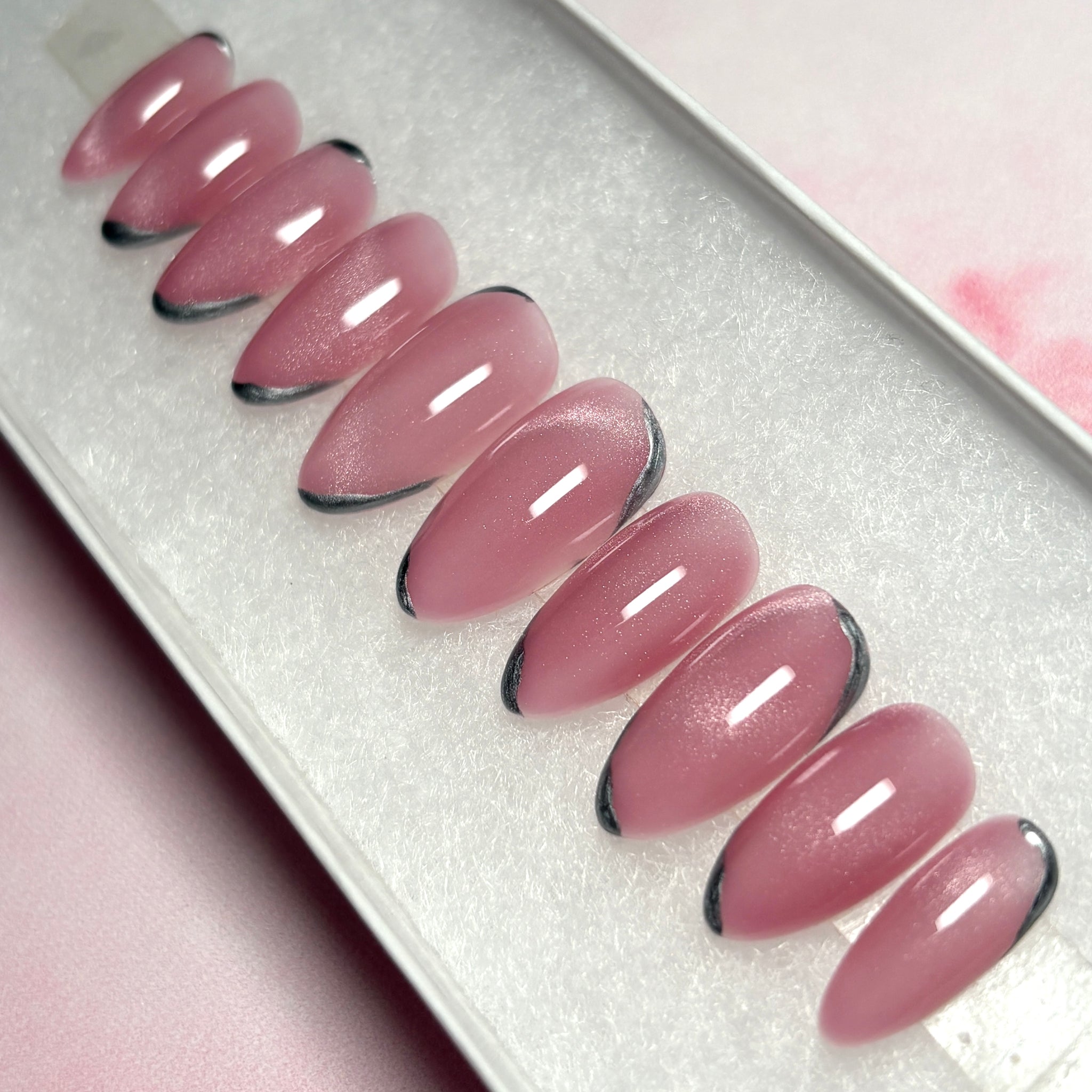 Cat eye press-on nails in shimmering pink with silver chrome accents. Handmade by a professional nail artist, these custom false nails offer a salon-quality finish with the convenience of reusable stick-on nails. All of the sets are available in short, long and 5+ shapes.