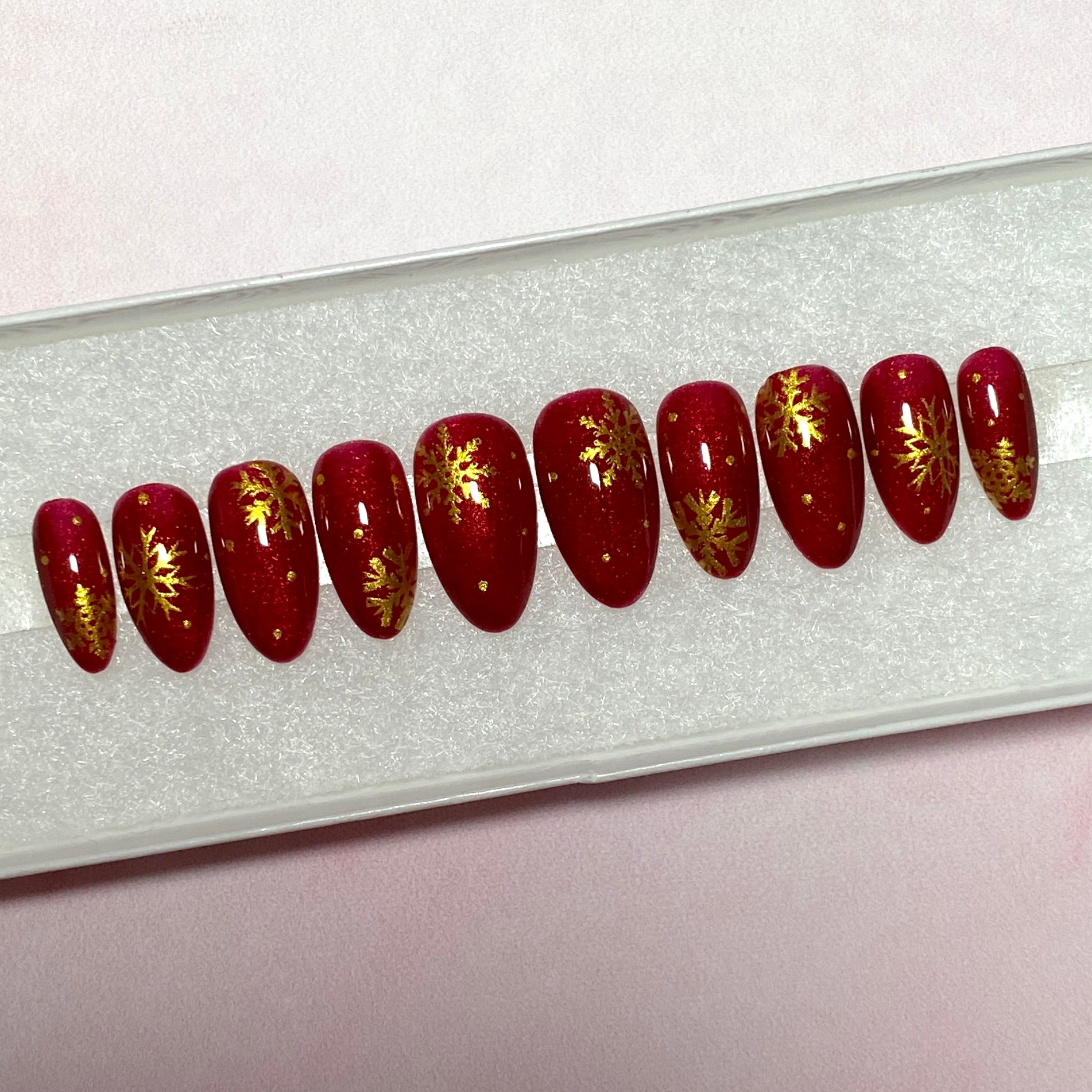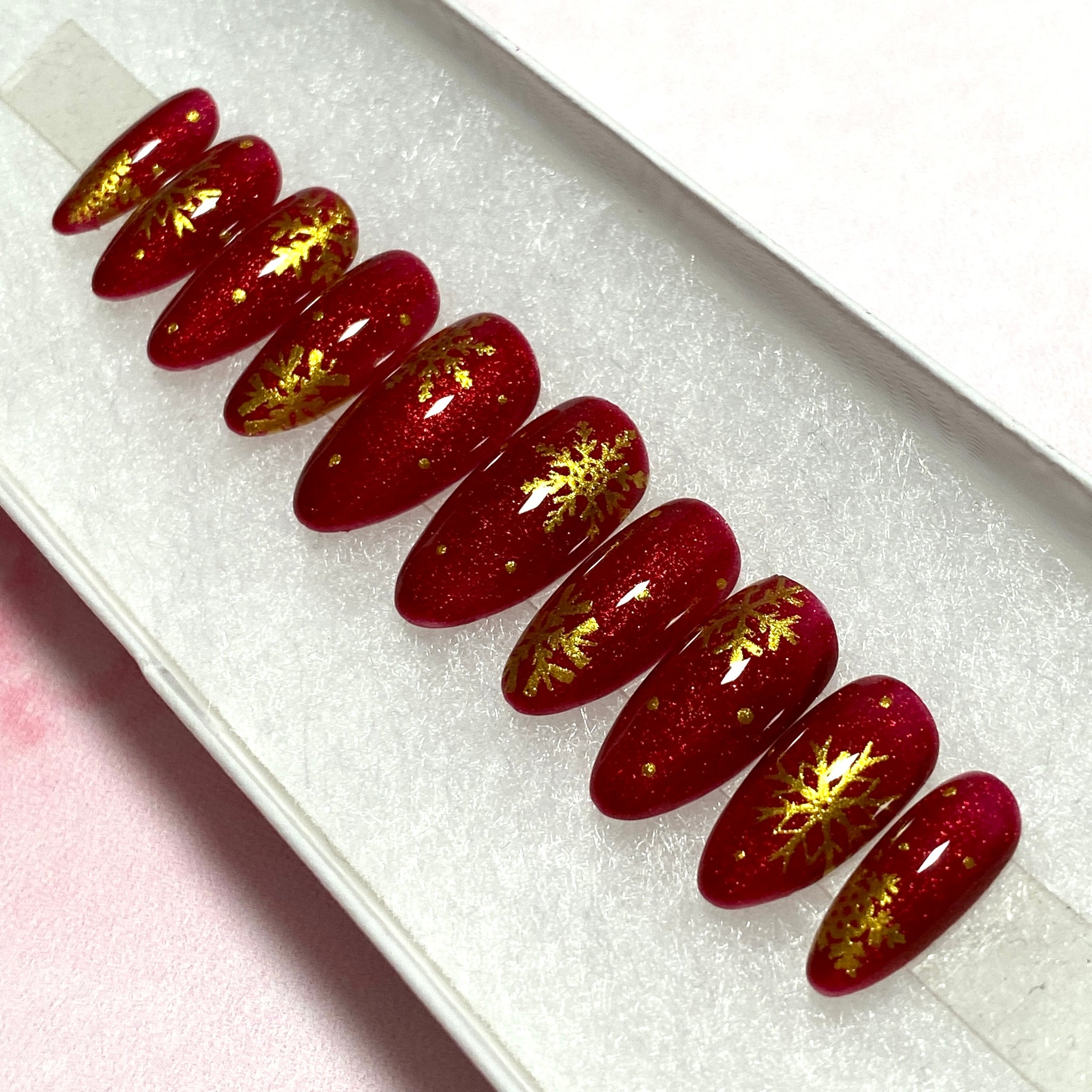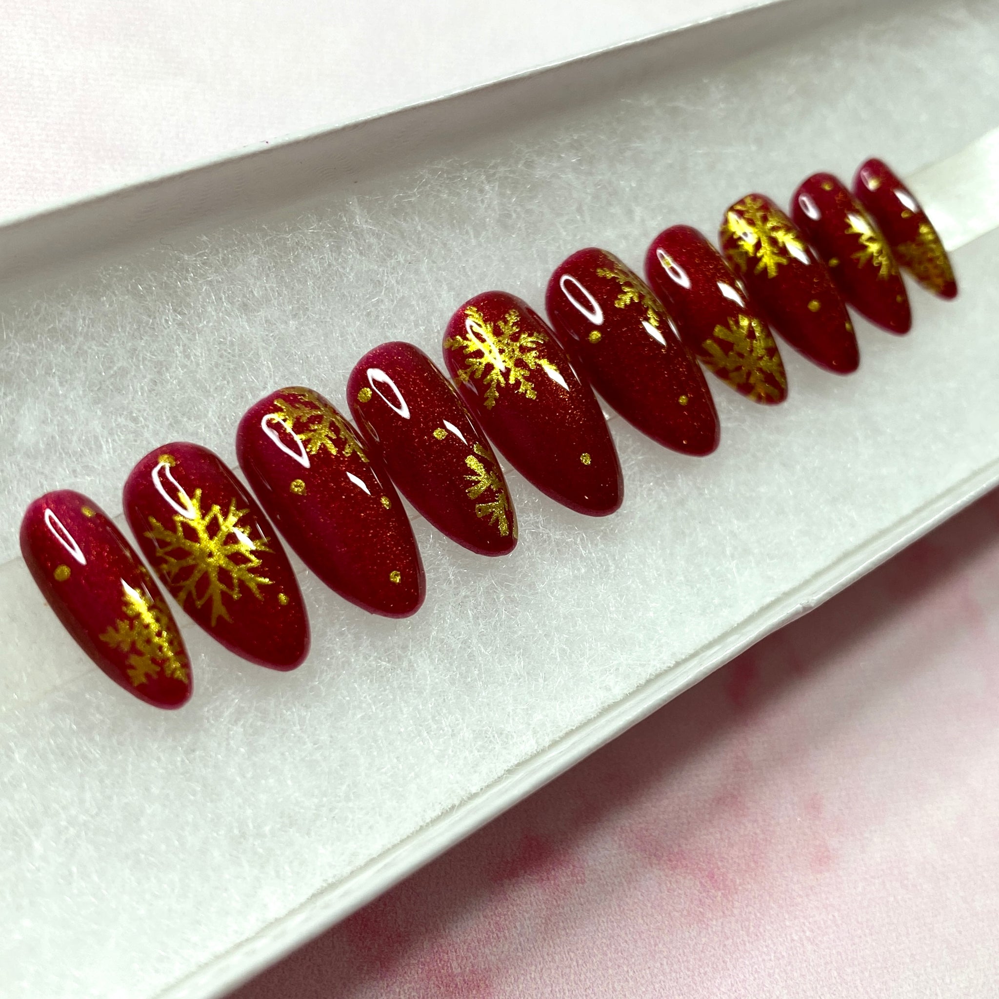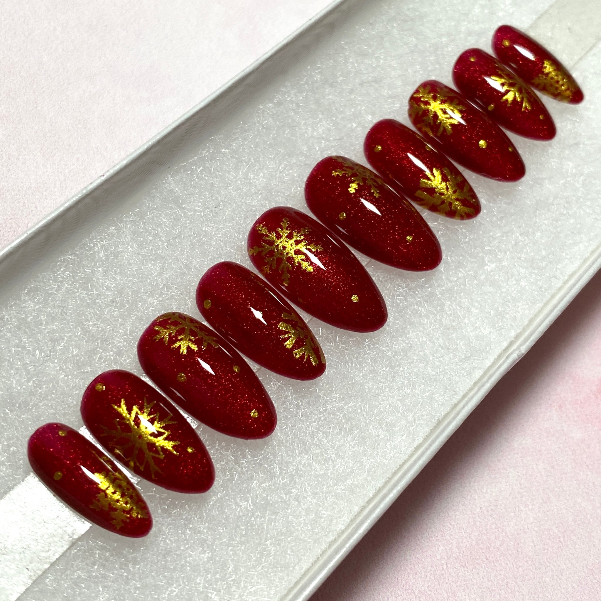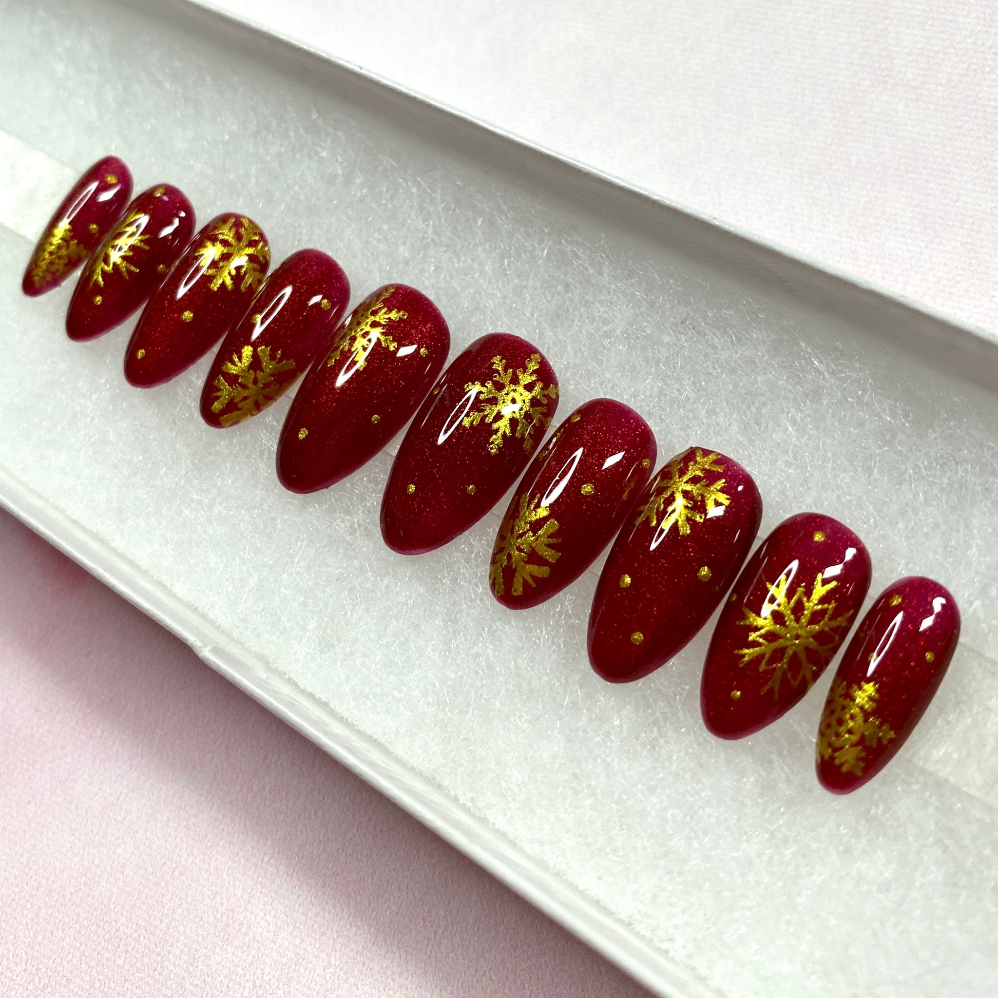 ✨Ruby Snowfall✨ Deep Crimson Red Shimmer Glitter with Gold Snowflakes and Dot Design