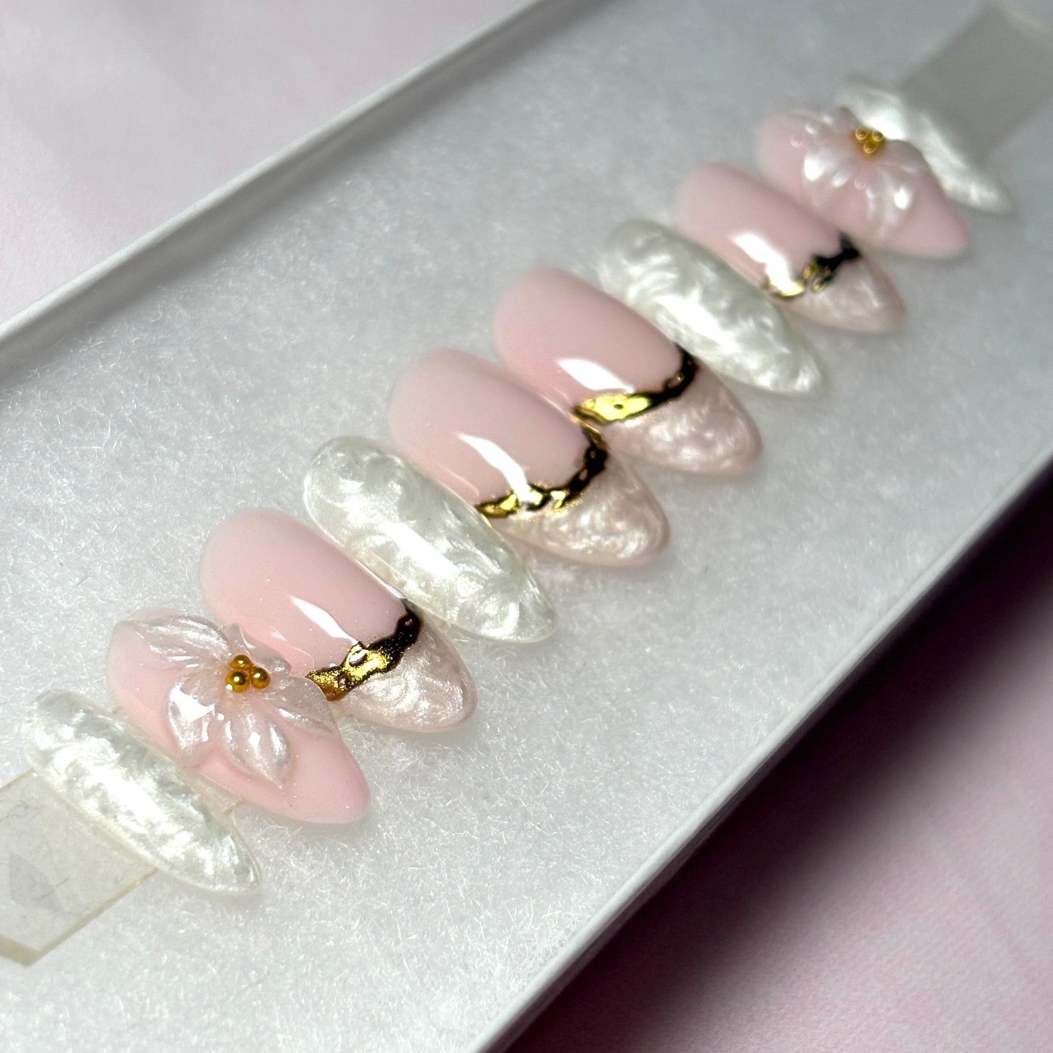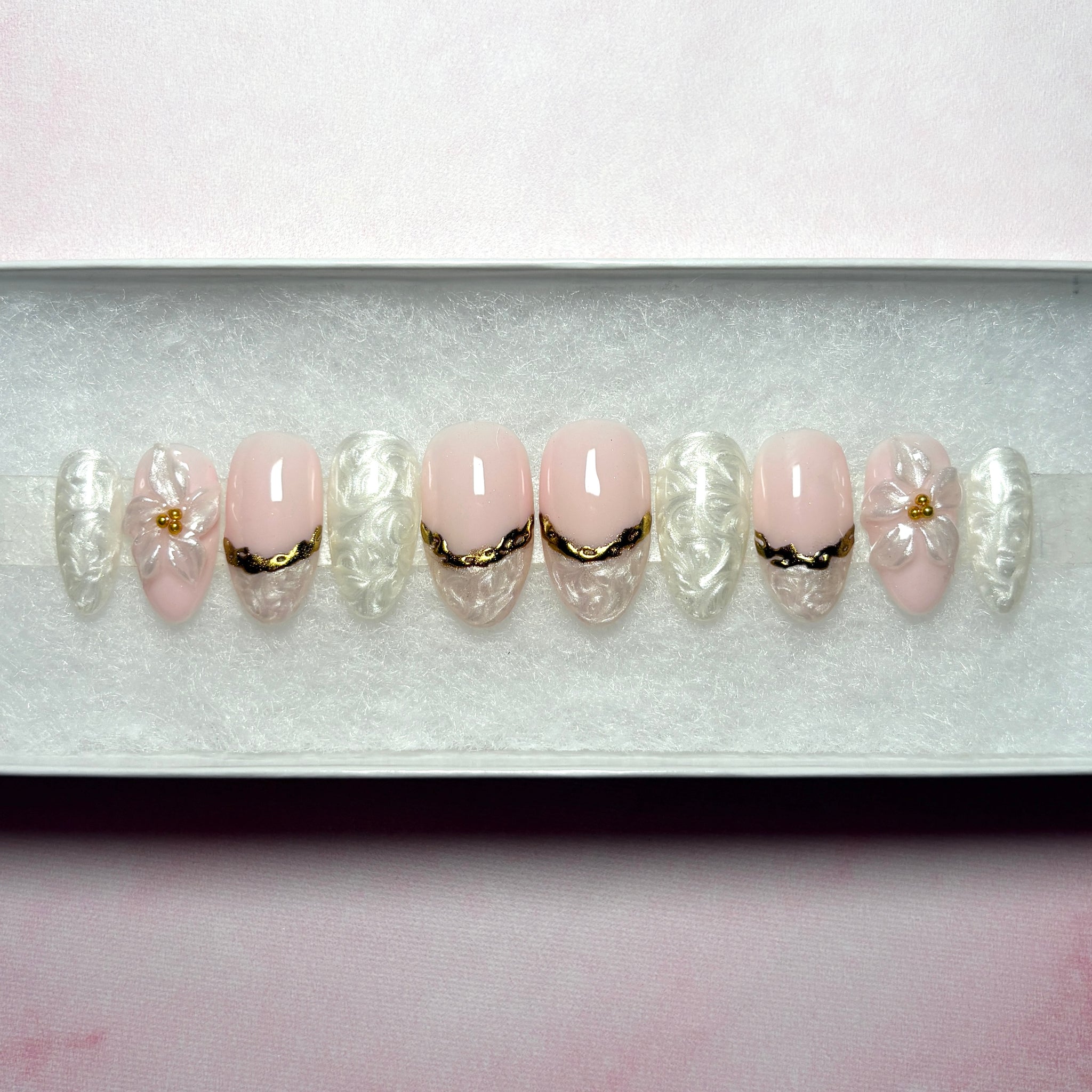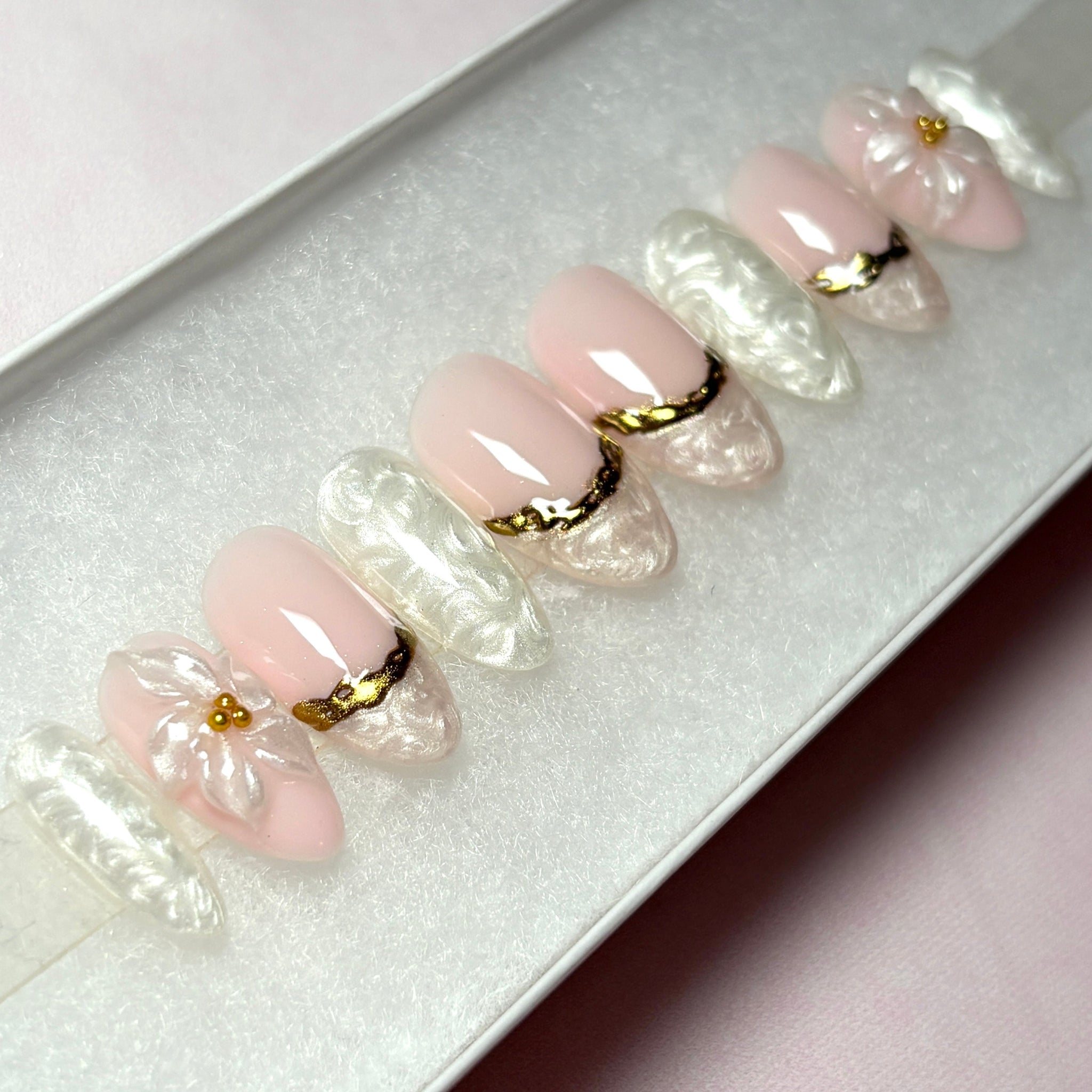 💅🏻 3D floral press-on nails handmade by a UK-based professional nail artist, in soft pink and white pearly shimmer with gold chrome accents. These custom false nails offer a salon-quality finish with the convenience of reusable stick-on nails. All of the sets are available in short, long and 5+ shapes.