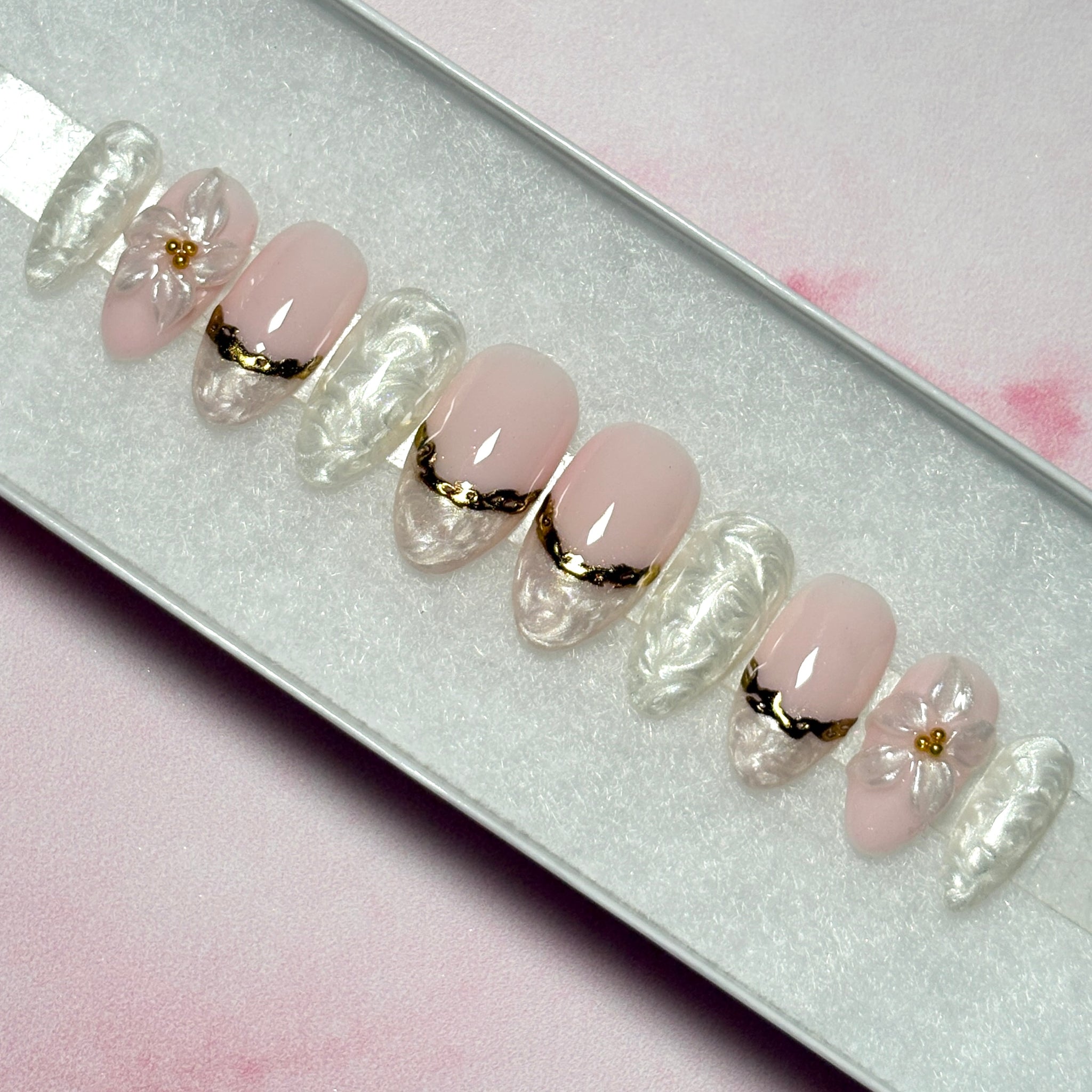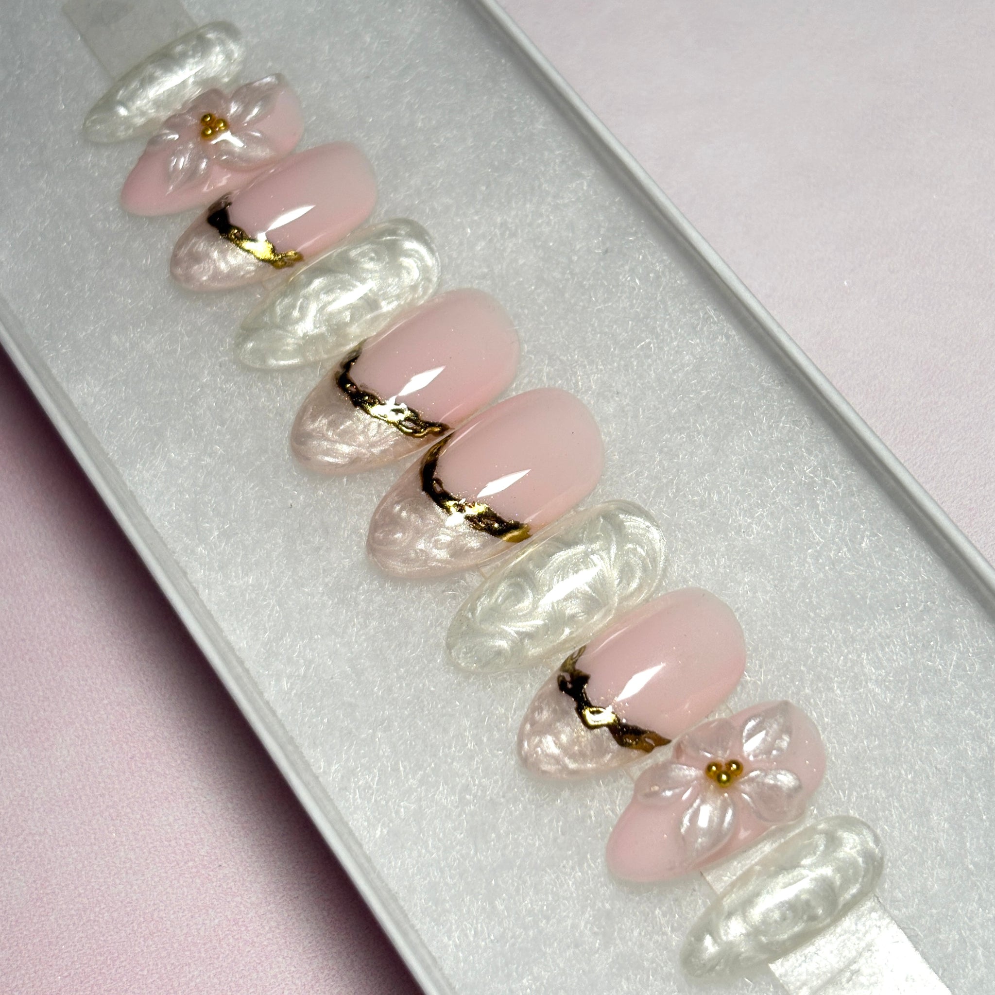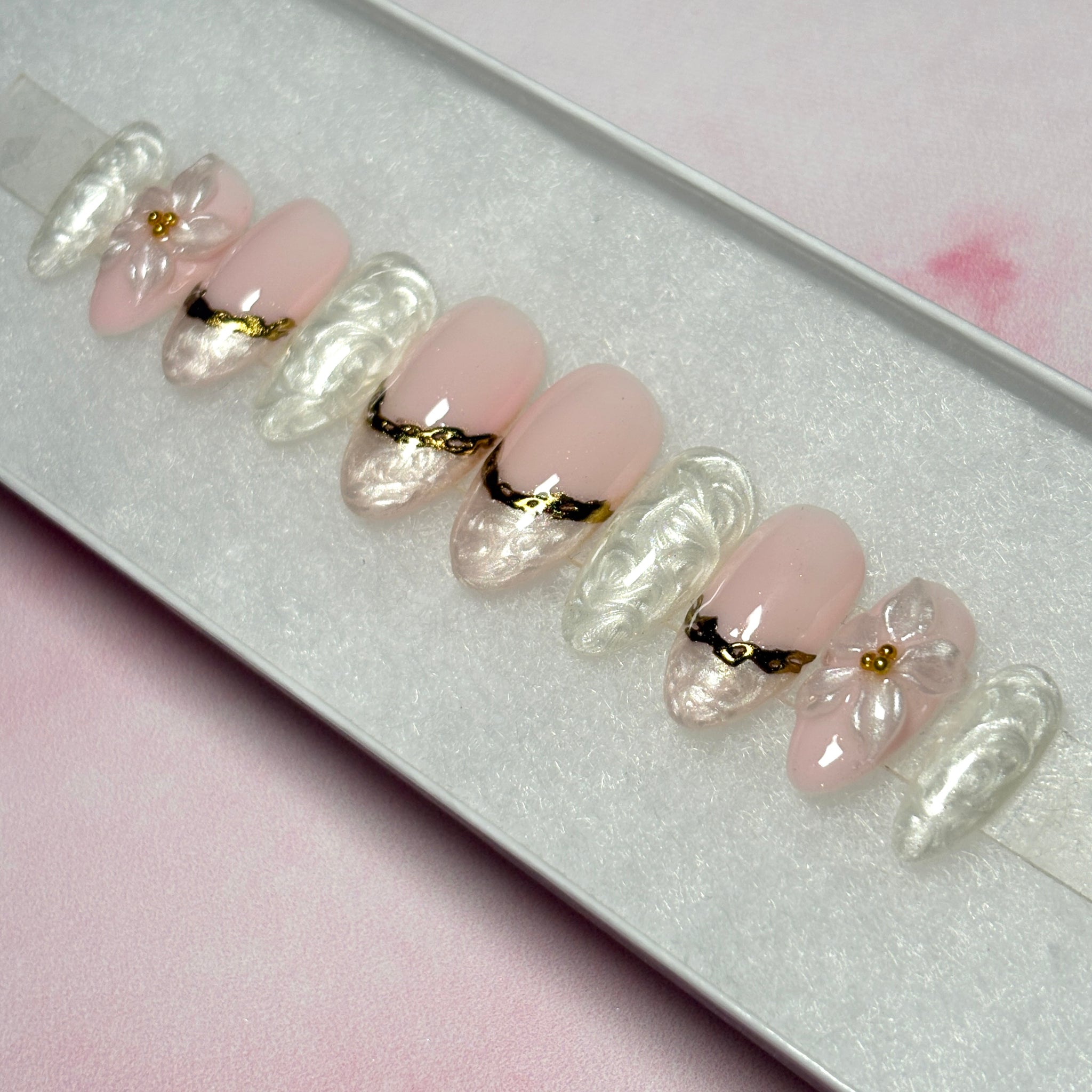 💅🏻 3D floral press-on nails handmade by a UK-based professional nail artist, in soft pink and white pearly shimmer with gold chrome accents. These custom false nails offer a salon-quality finish with the convenience of reusable stick-on nails. All of the sets are available in short, long and 5+ shapes.
