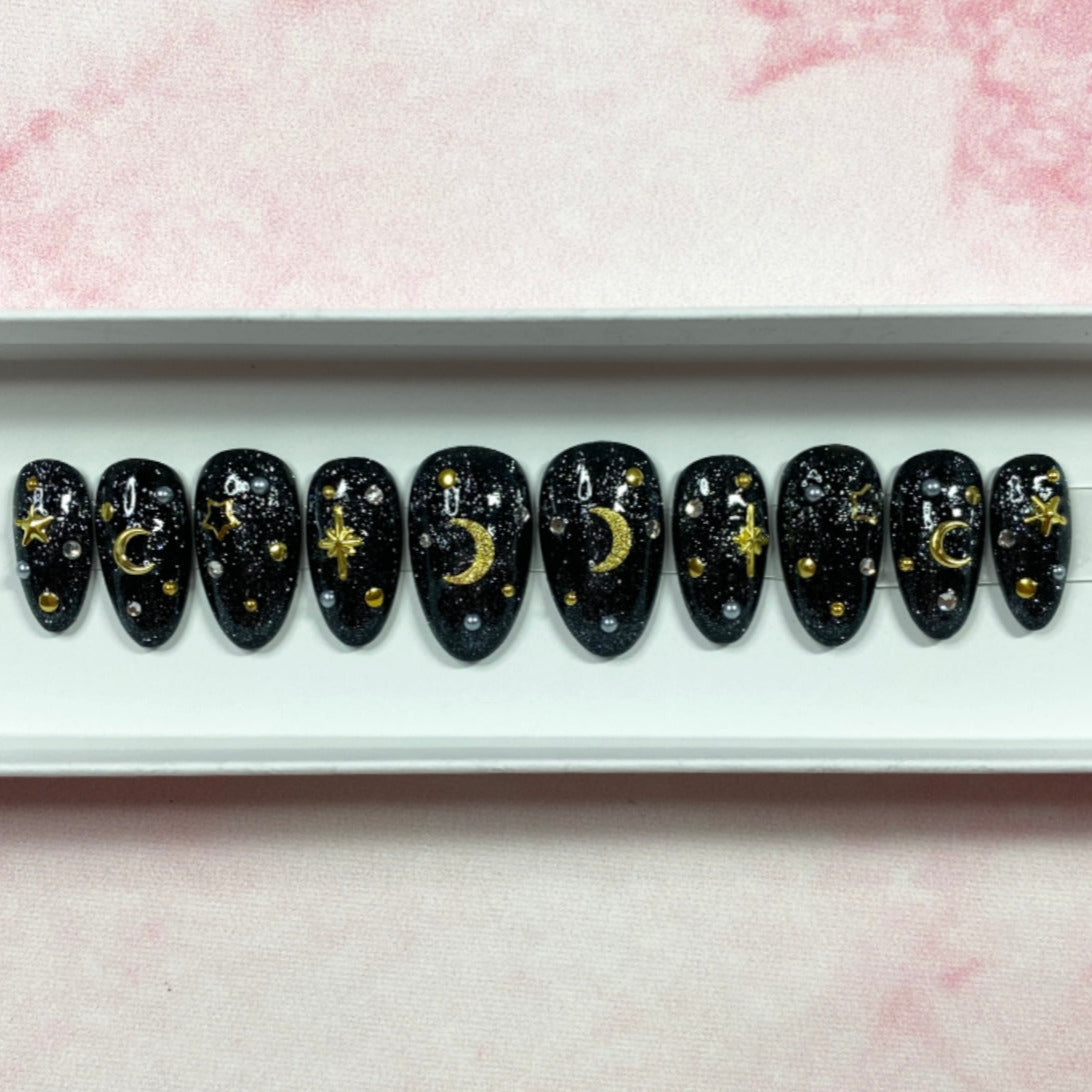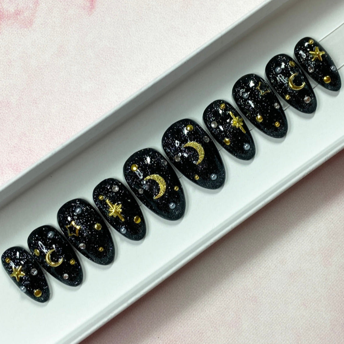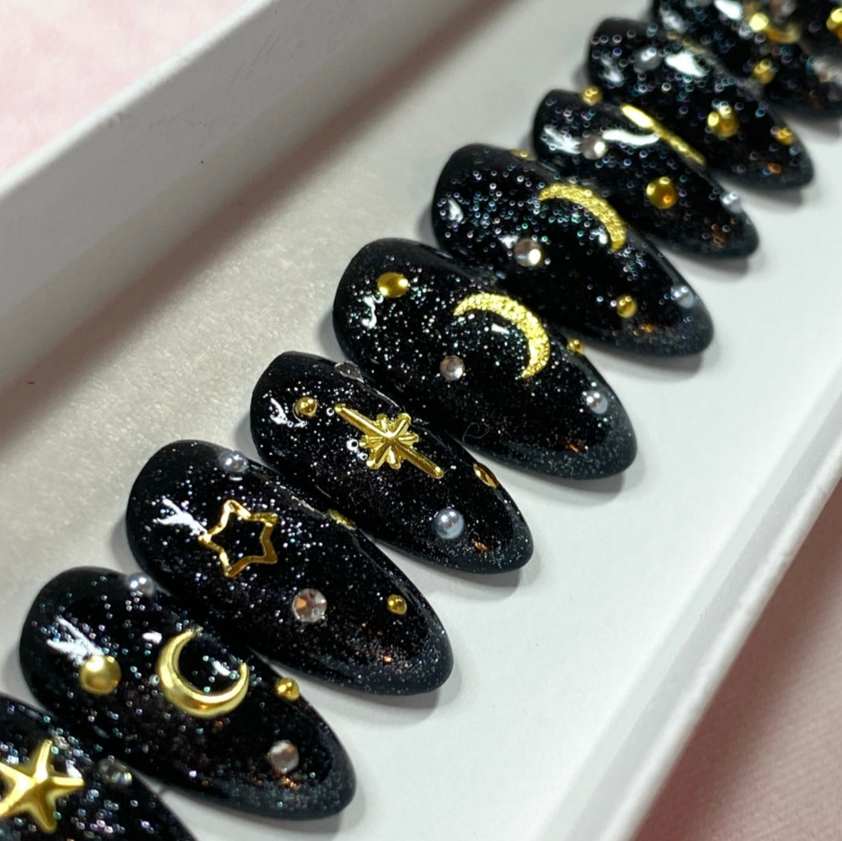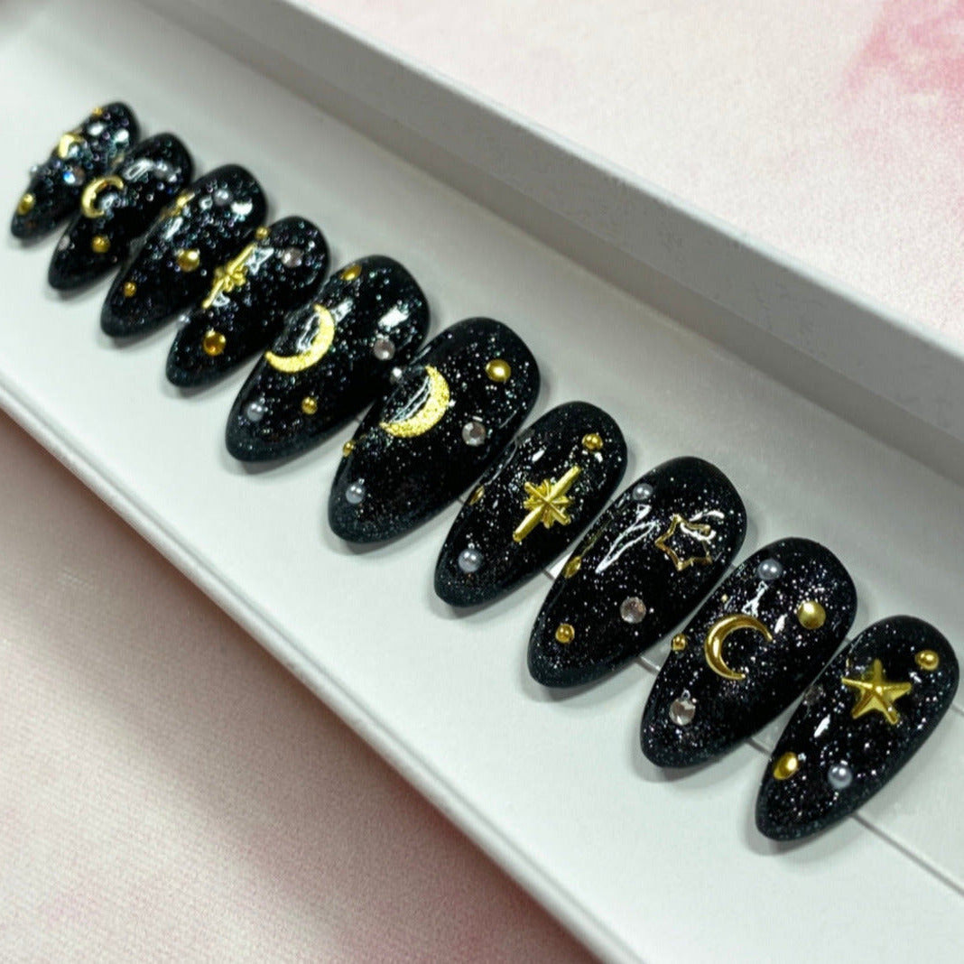 ✨Spellbound✨ Black Shimmer Glitter & 3D Gold Moon & Star Gems, Pearls & Rhinestones
