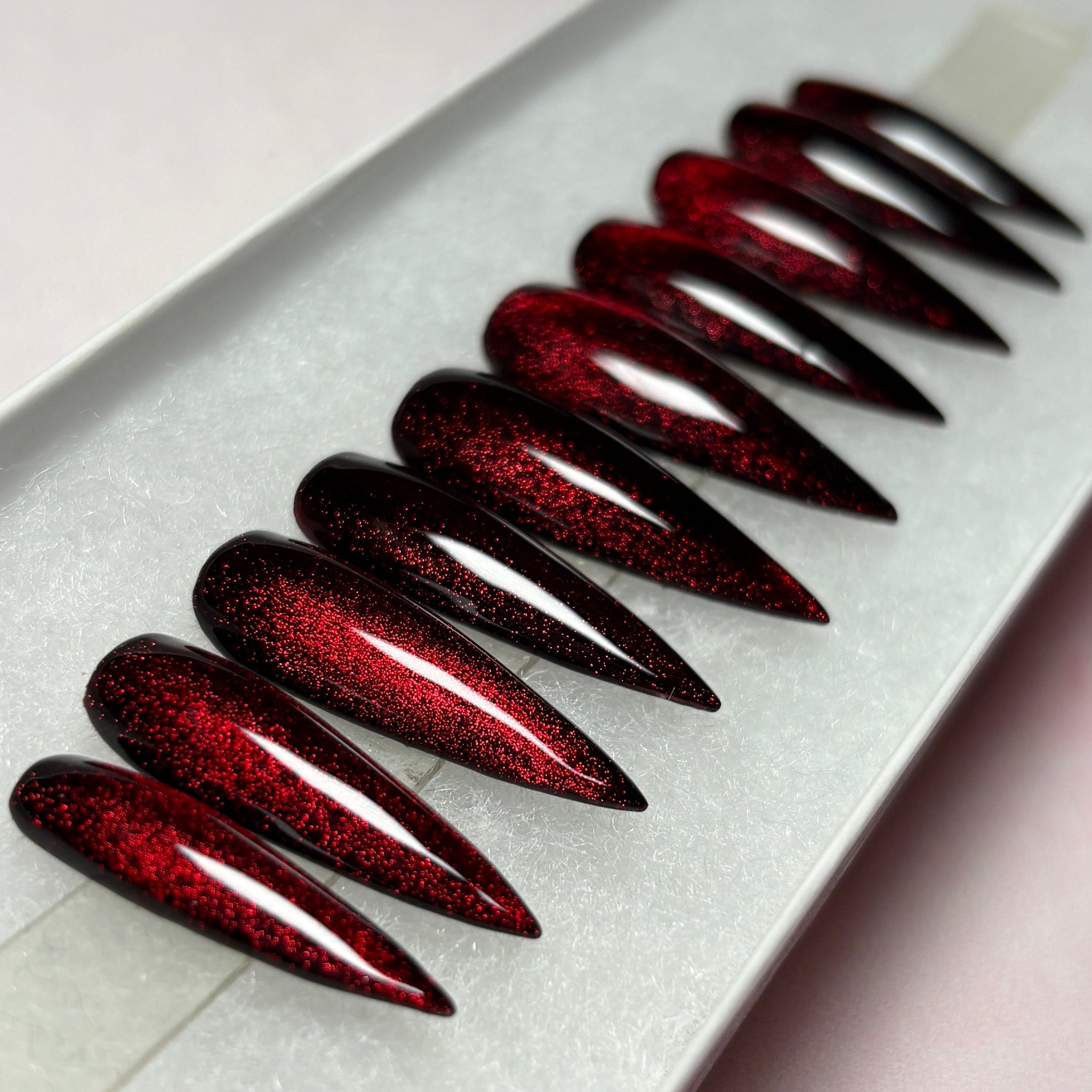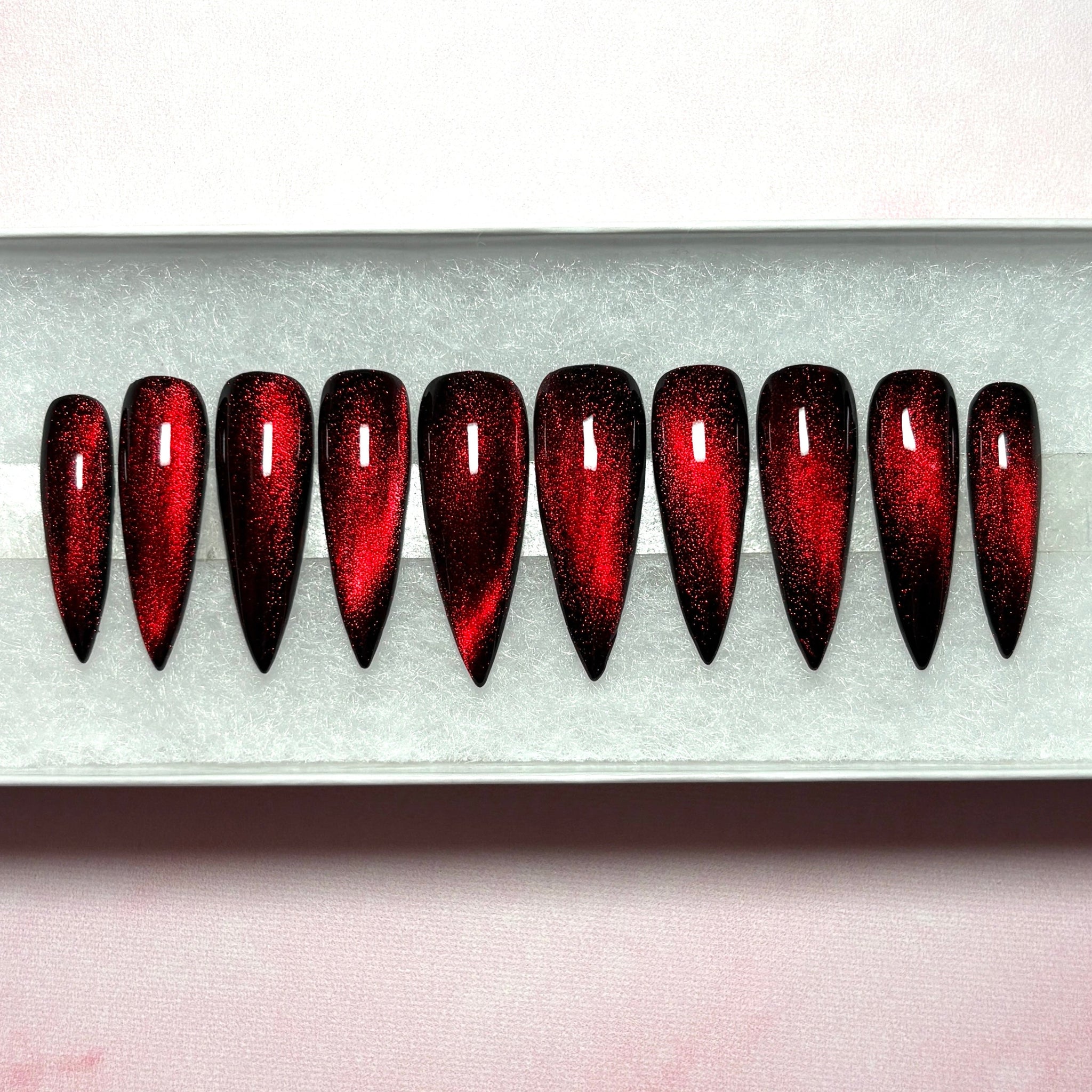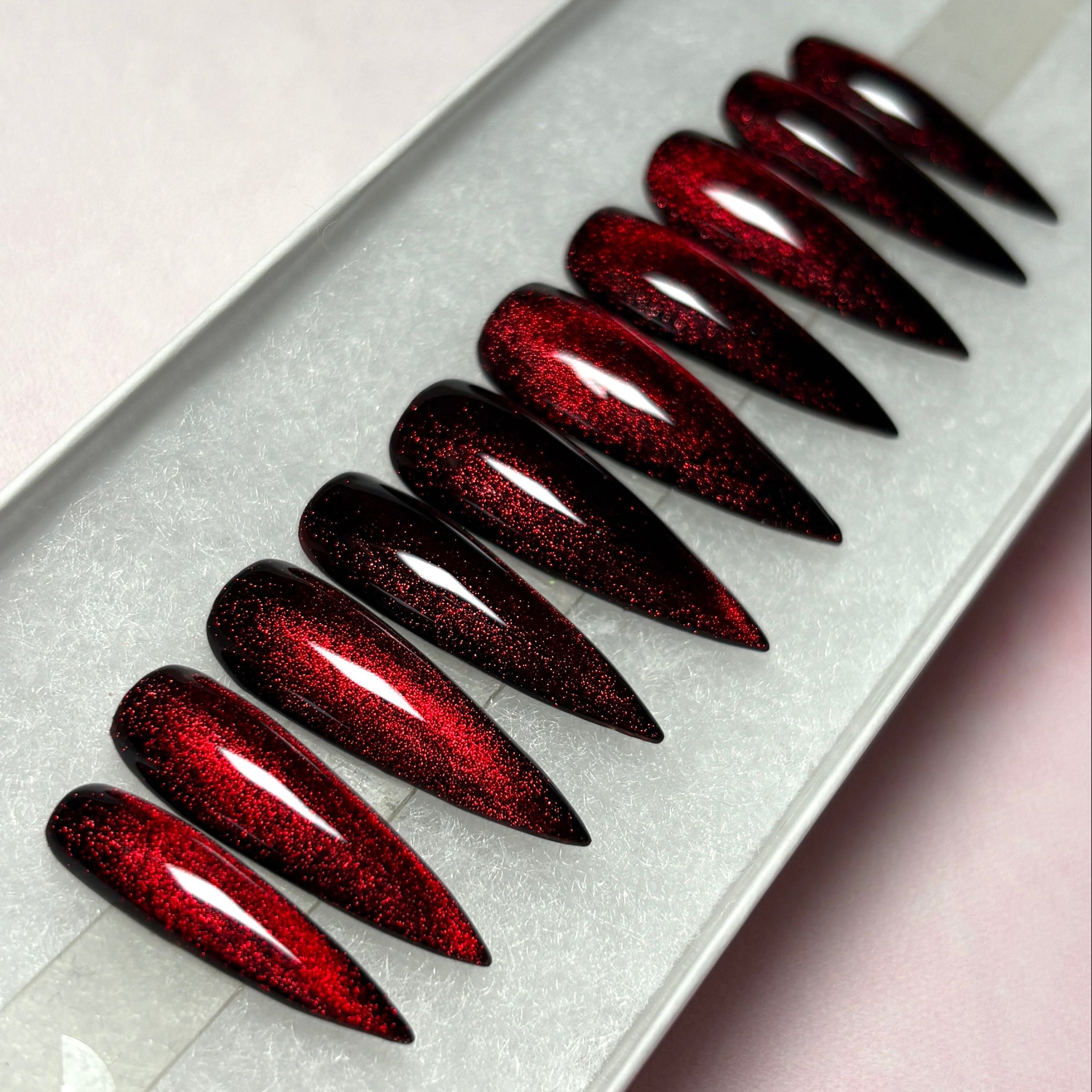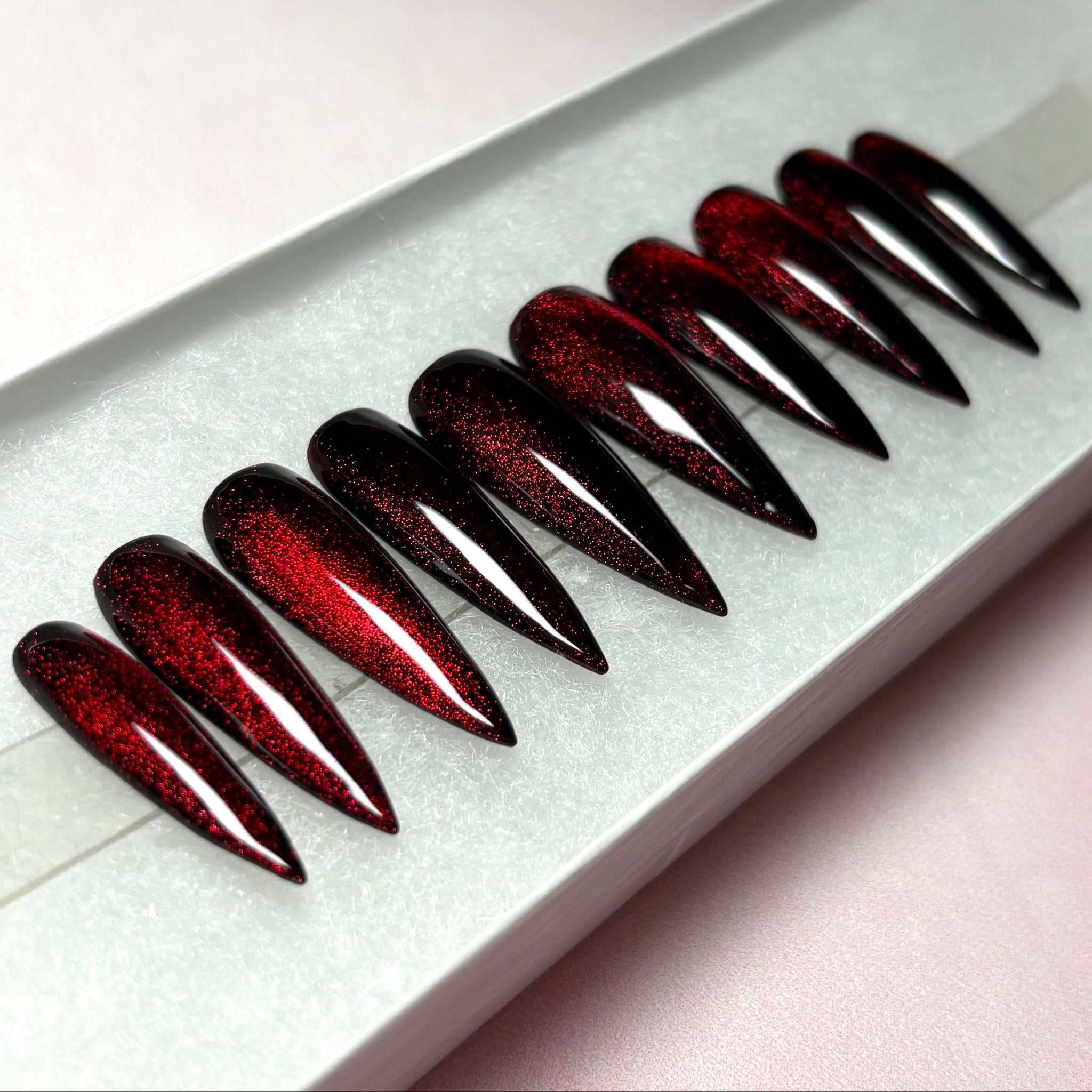 Blood-red cat eye handmade press-on nails that colour-shift between deep red-crimson and black. These custom false nails, crafted by a UK-based professional nail artist, offer a salon-quality finish with the convenience of reusable stick-on nails. All of the sets are available in short, long and 5+ shapes.