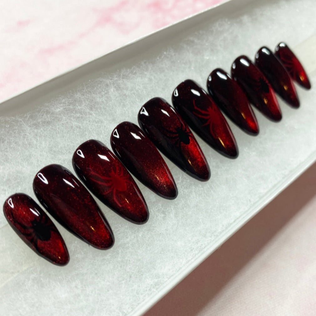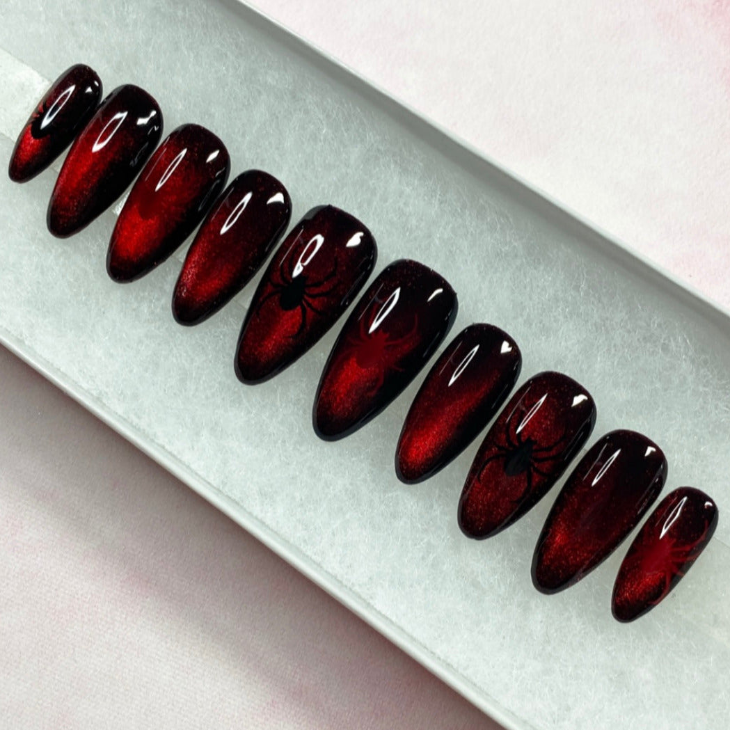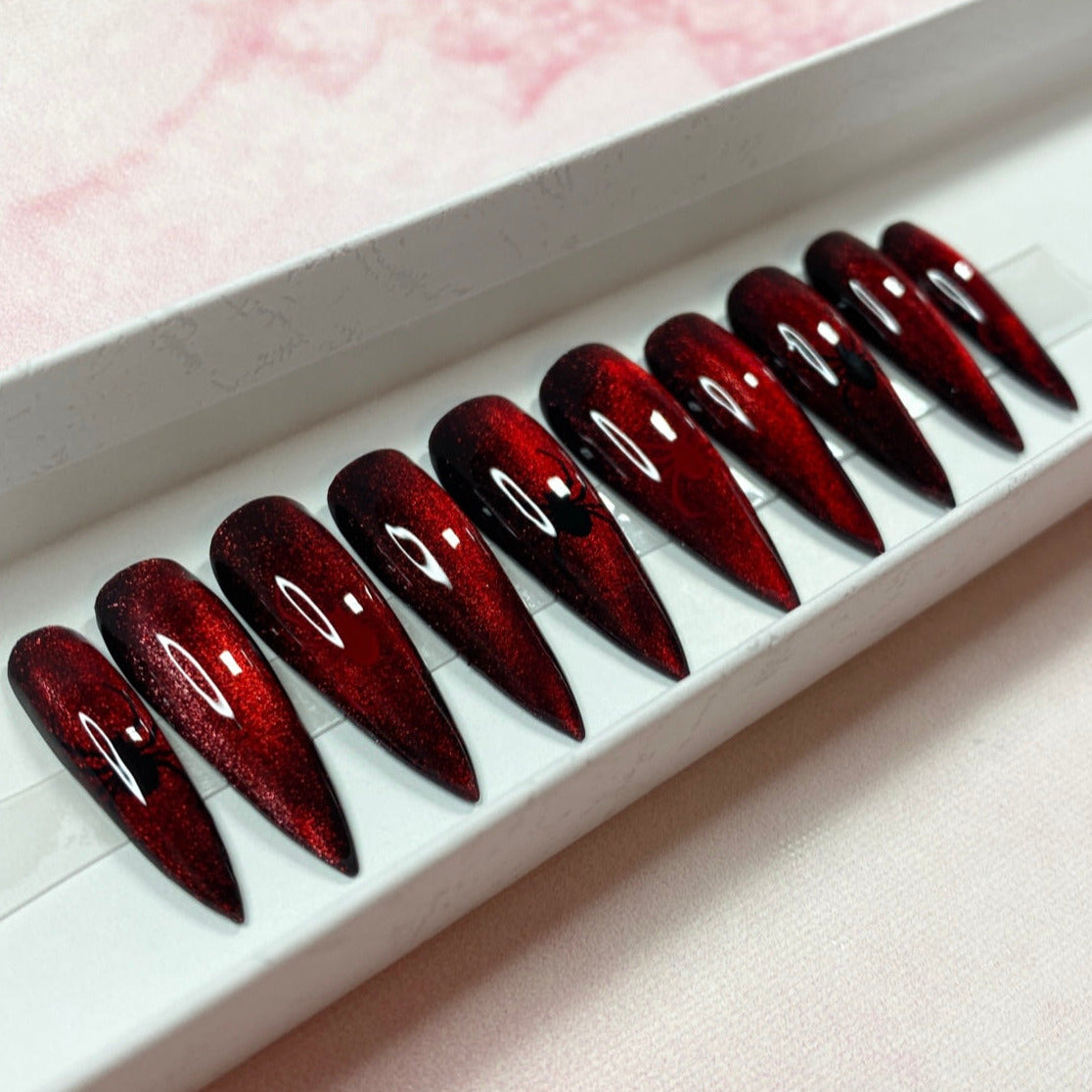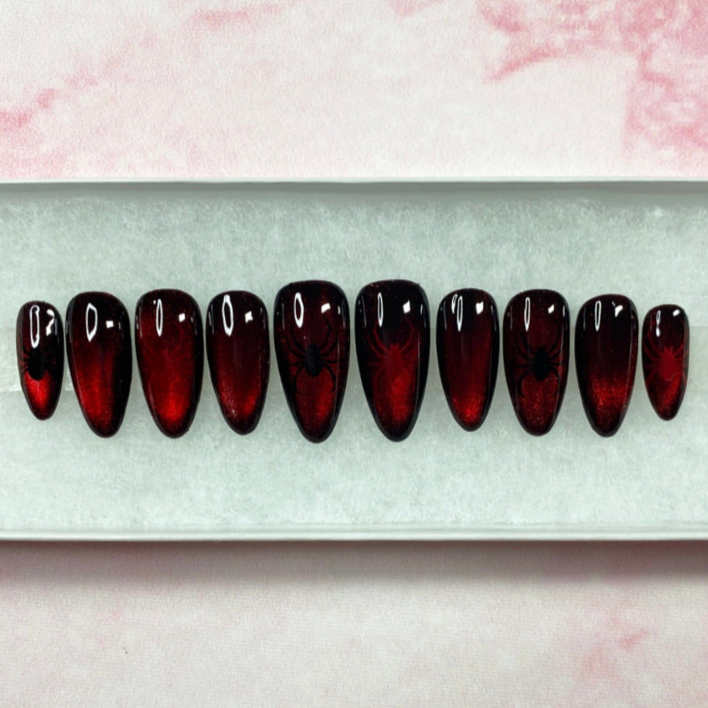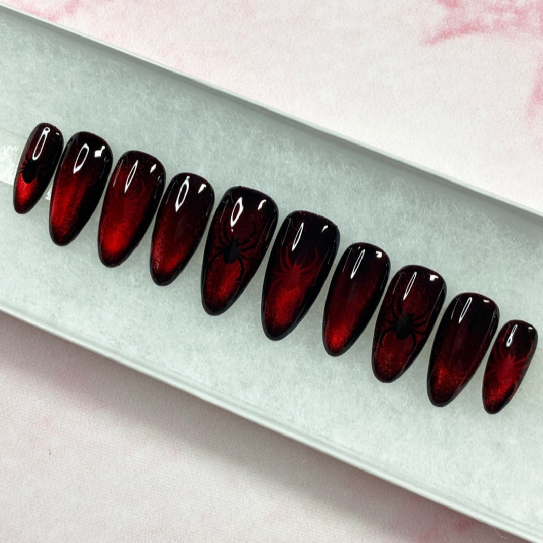 ✨Venom✨ Blood-Red Cat Eye with 6 Encapsulated Spiders Design In Deep Burgundy, Black, White.