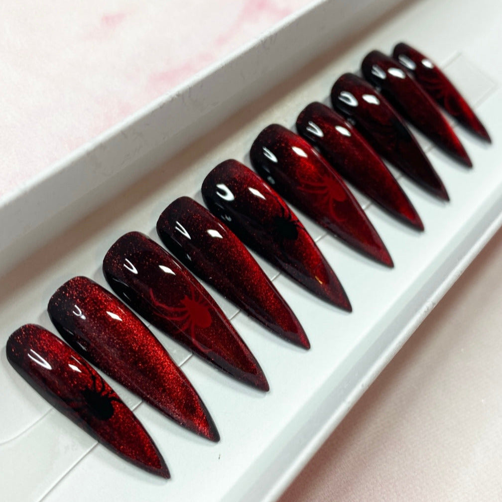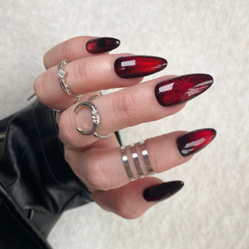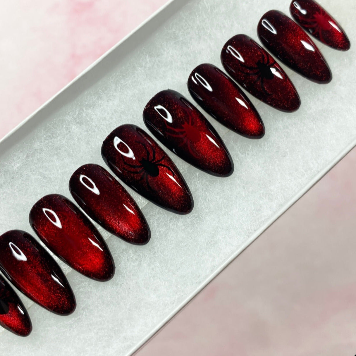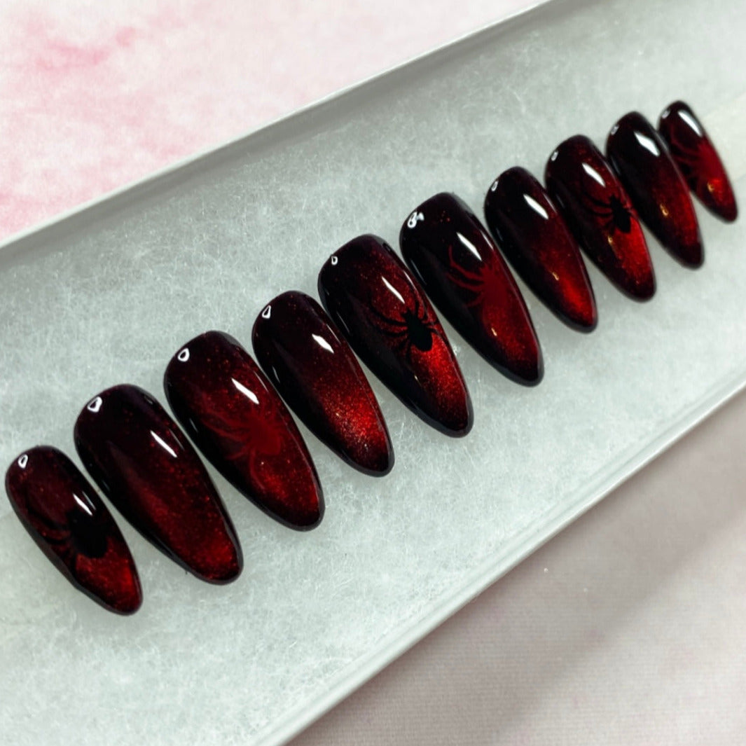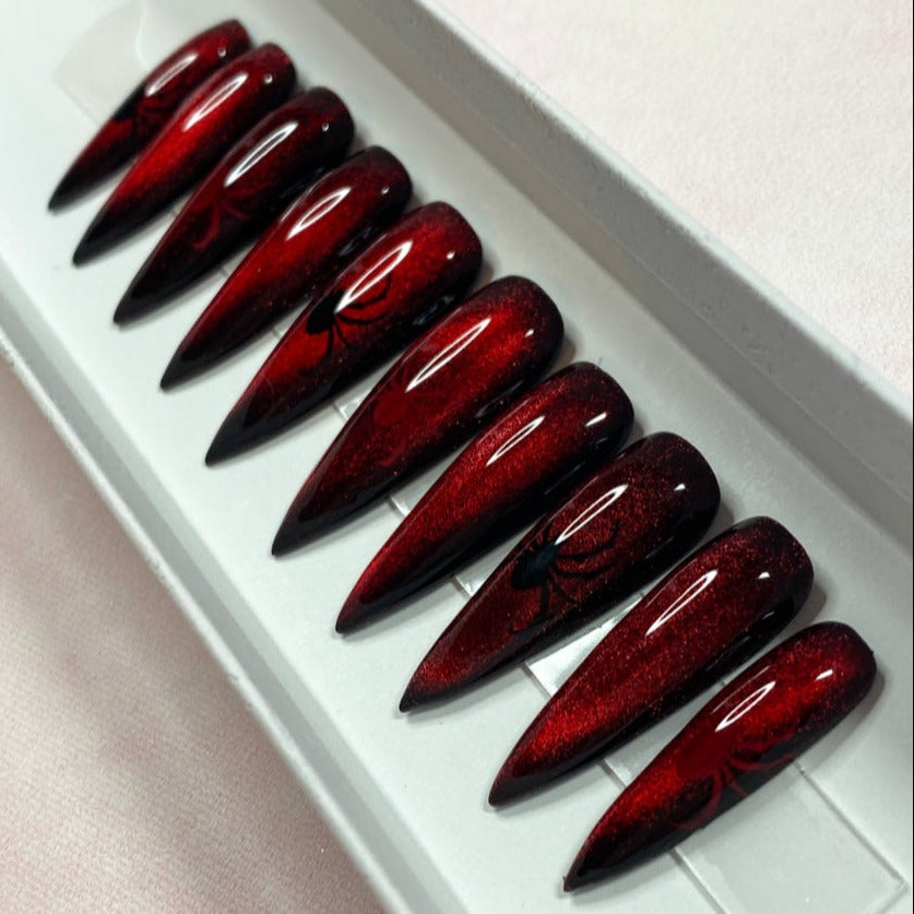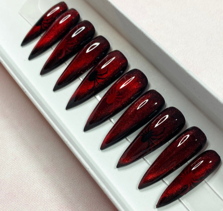 ✨Venom✨ Blood-Red Cat Eye with 6 Encapsulated Spiders Design In Deep Burgundy, Black, White.