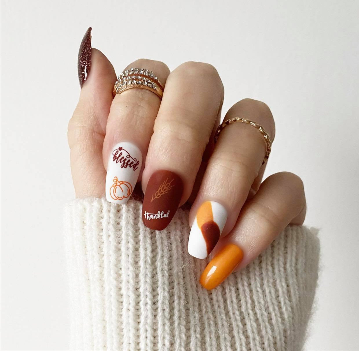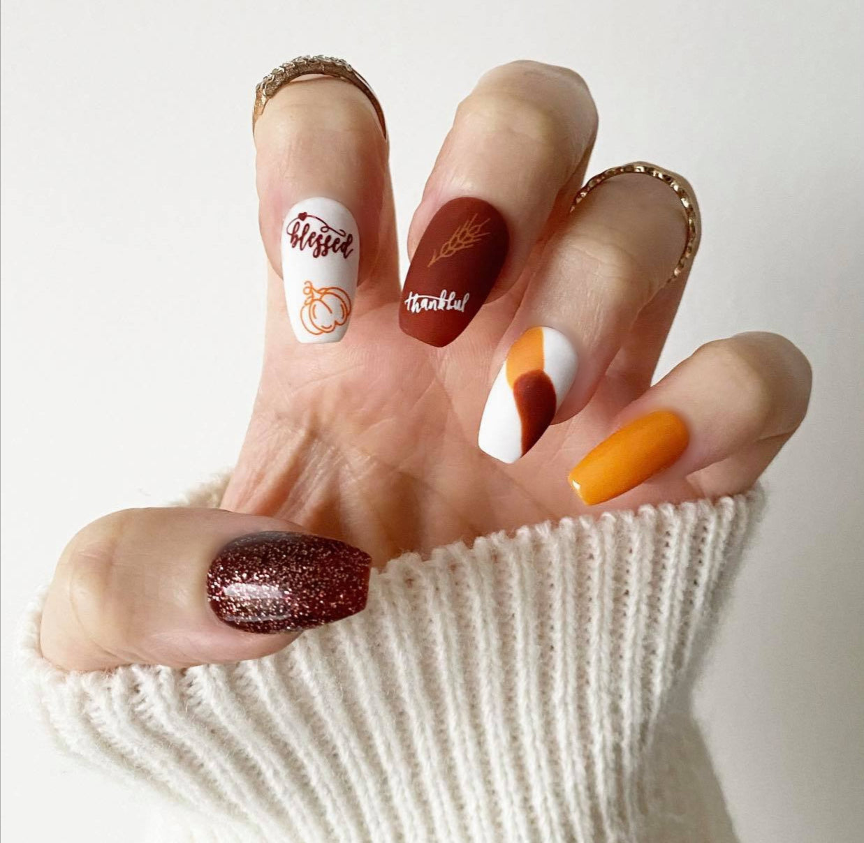 ✨Grateful✨ Matte and Glossy Earthy Browns, Oranges and White, with "Blessed", "Thankful" Wording, Leaves, Acorns, Corn and Pumpkins
